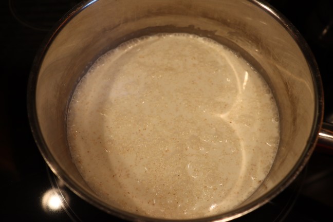Milk, cream, and nutmeg being brought to a boil.