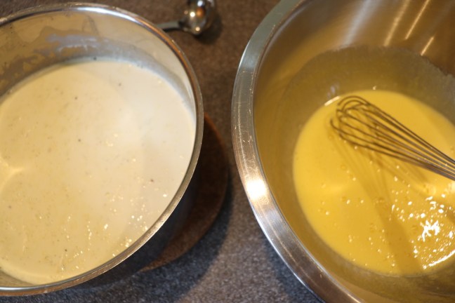 Ready to slowly add warm cream to yolks.