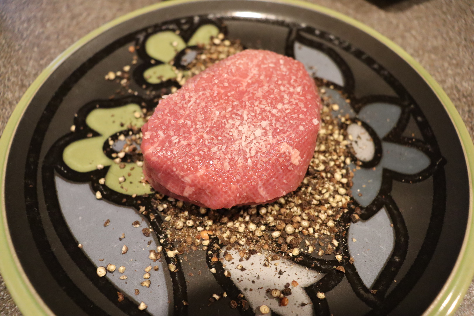 Filets (the right filet is the larger butterflied one) seasoned with Kosher salt and pressed into coarse black pepper.