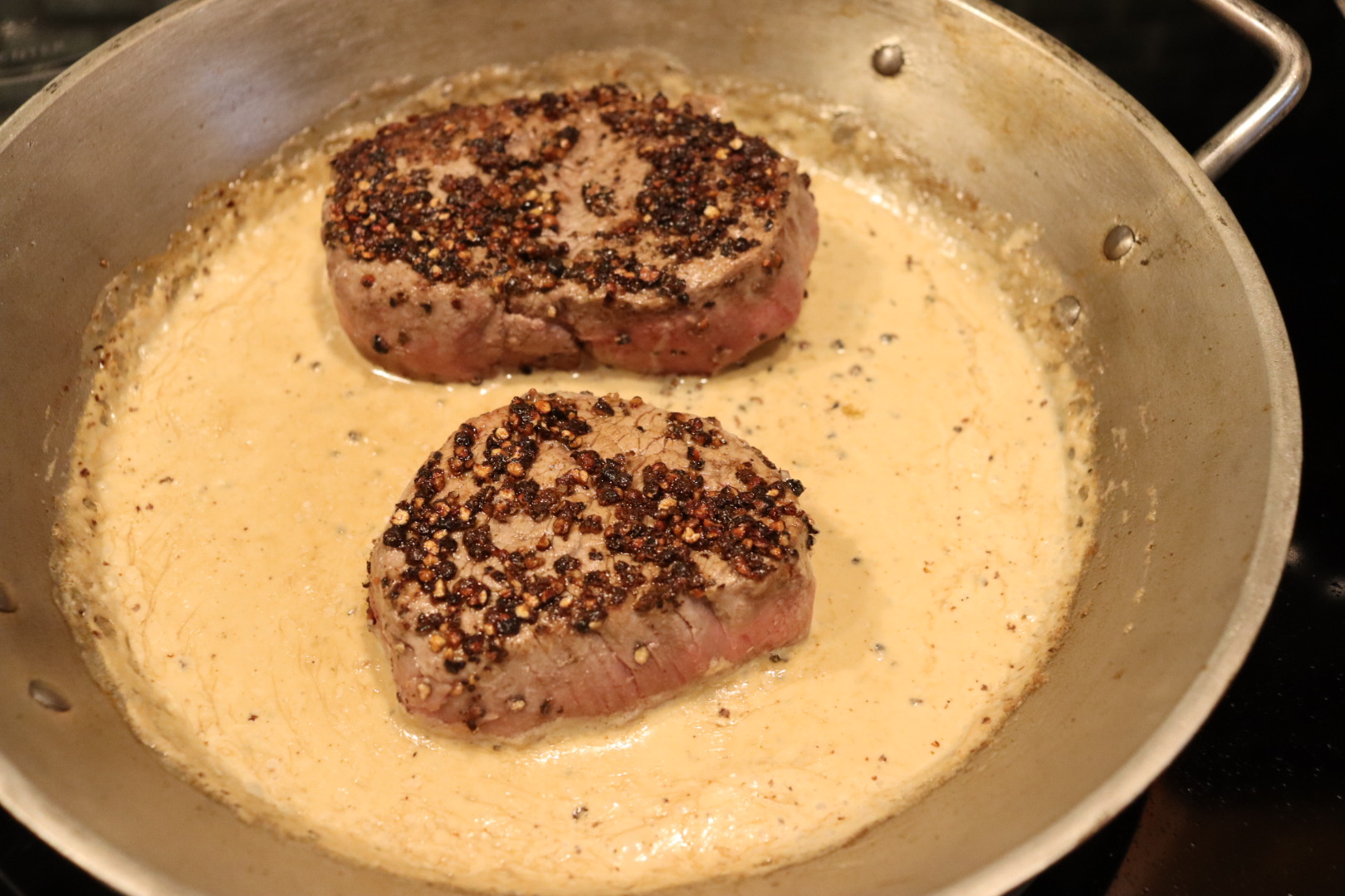 Steaks added back to the pan with the sauce.