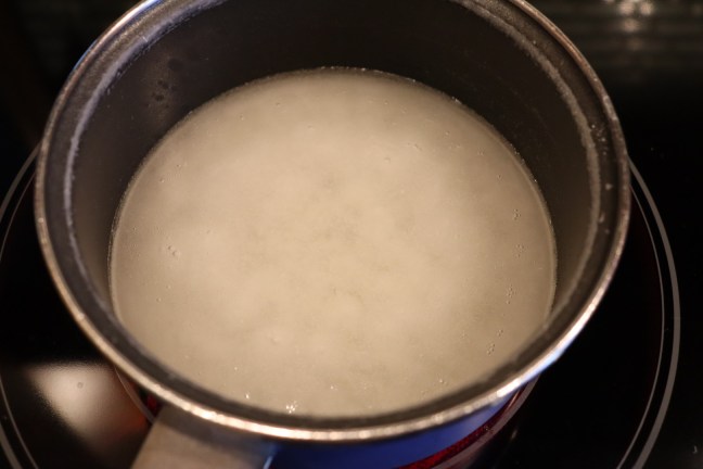 Making rich simple syrup by dissolving 2 C sugar in 1 C water.