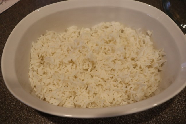 Cooked rice placed in bottom of baking dish.