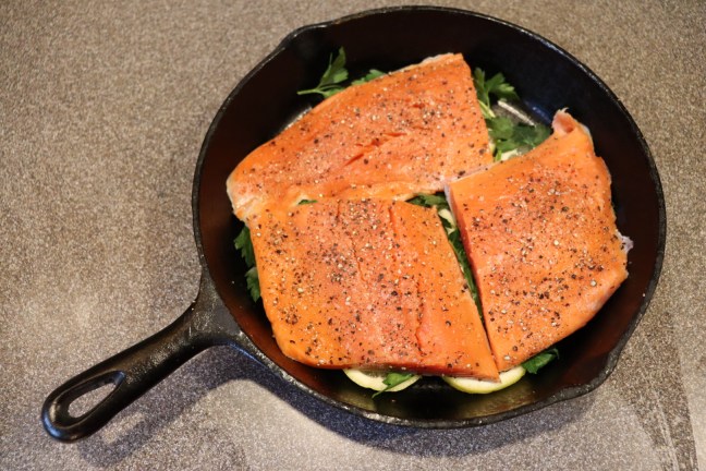 Salmon placed on top of lemon/parsley.