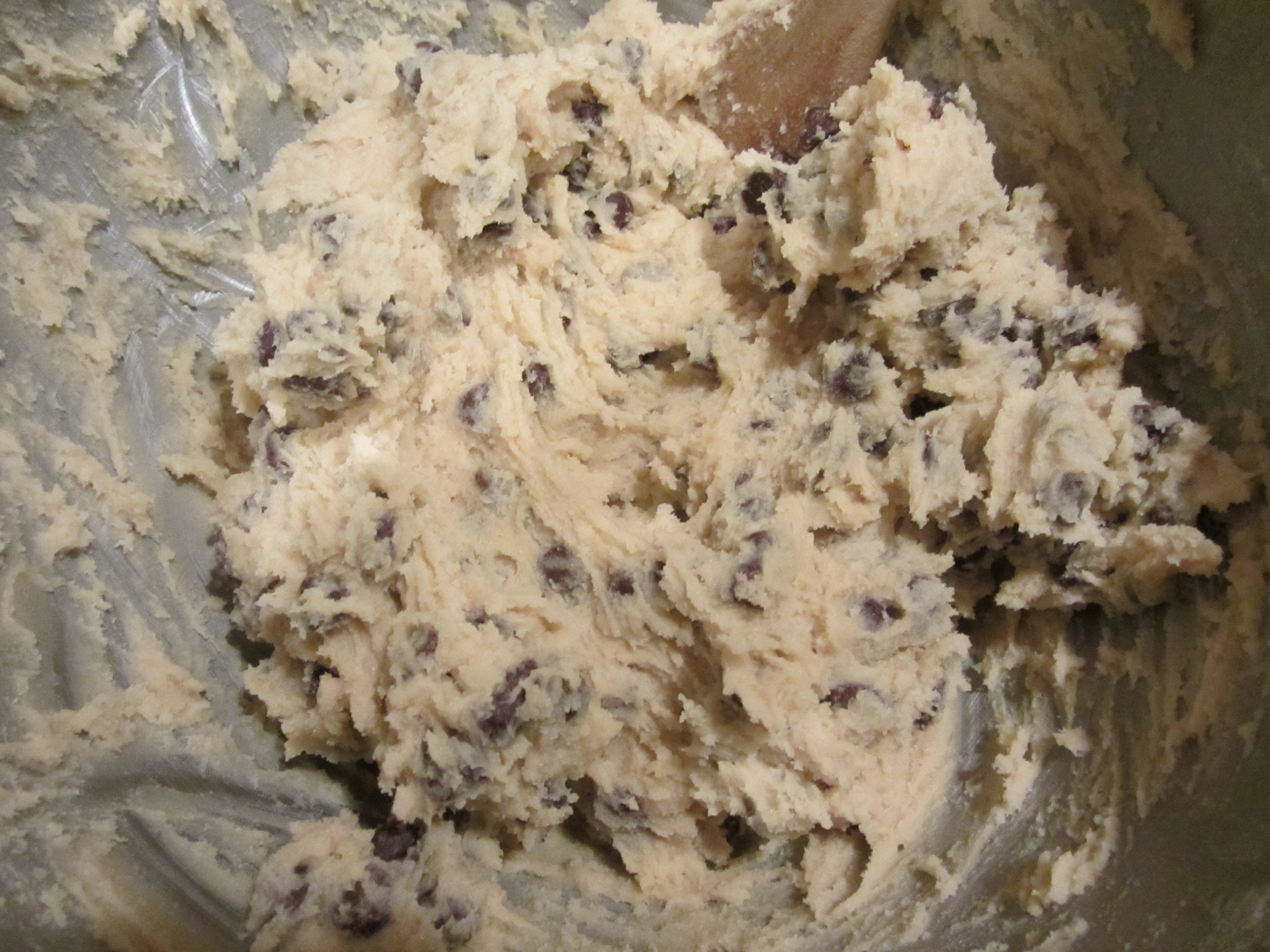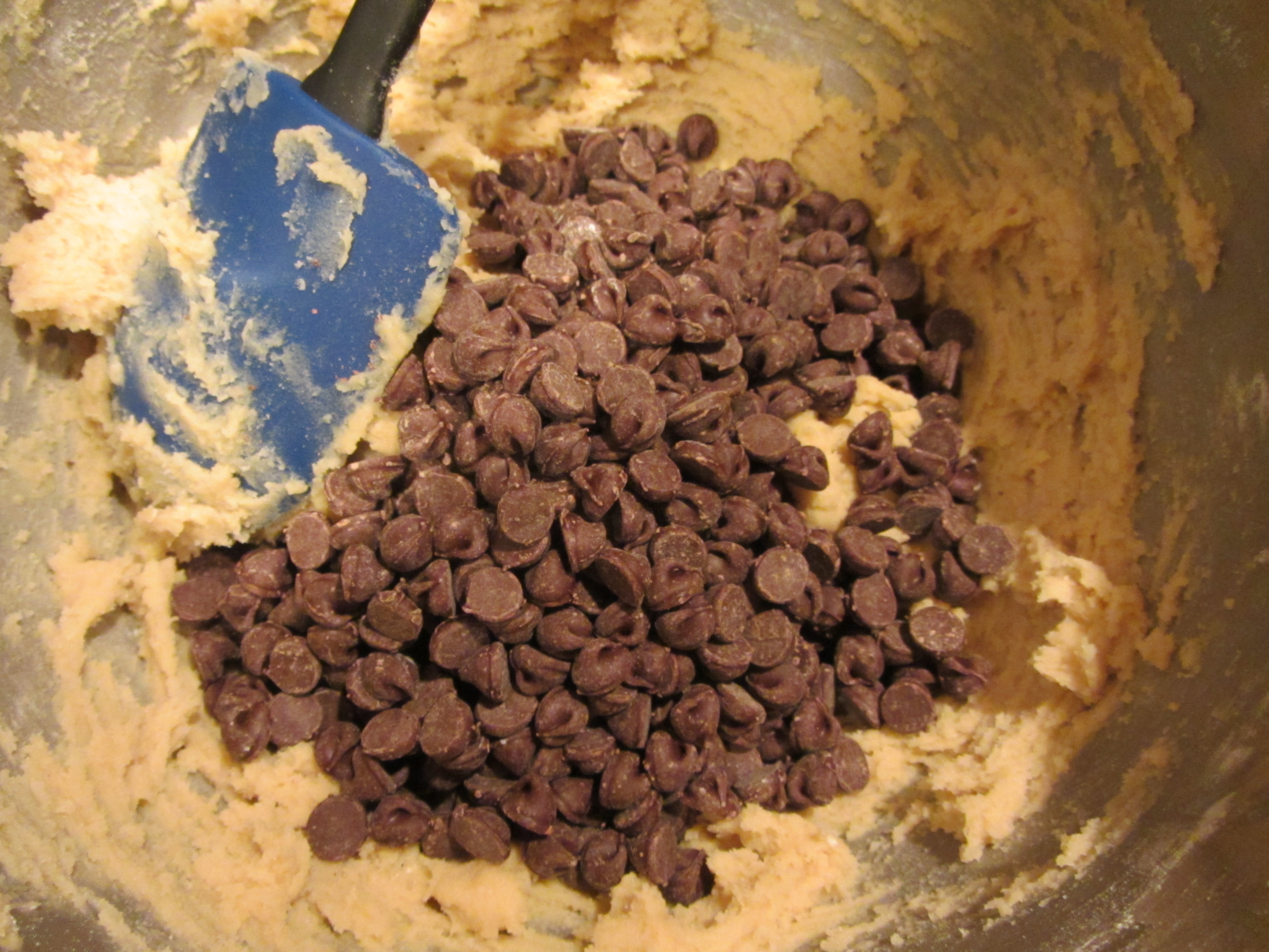 Once all of the flour is incorporated, stir in 2 C of semi-sweet chocolate chips.