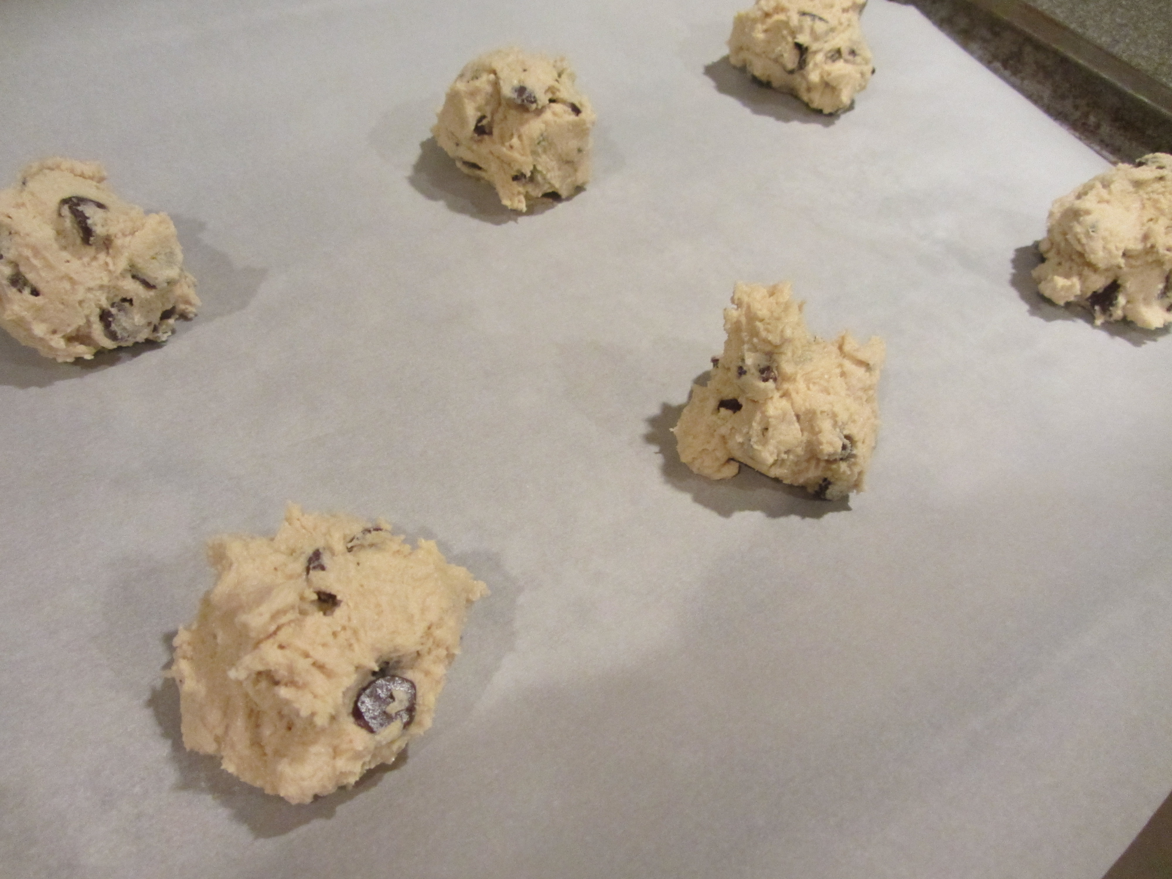 If you have one, use a #20 disher to spoon the dough onto parchment-lined baking sheets, with six cookies per sheet; I used an ice cream scoop, which resulted in pretty large cookies.