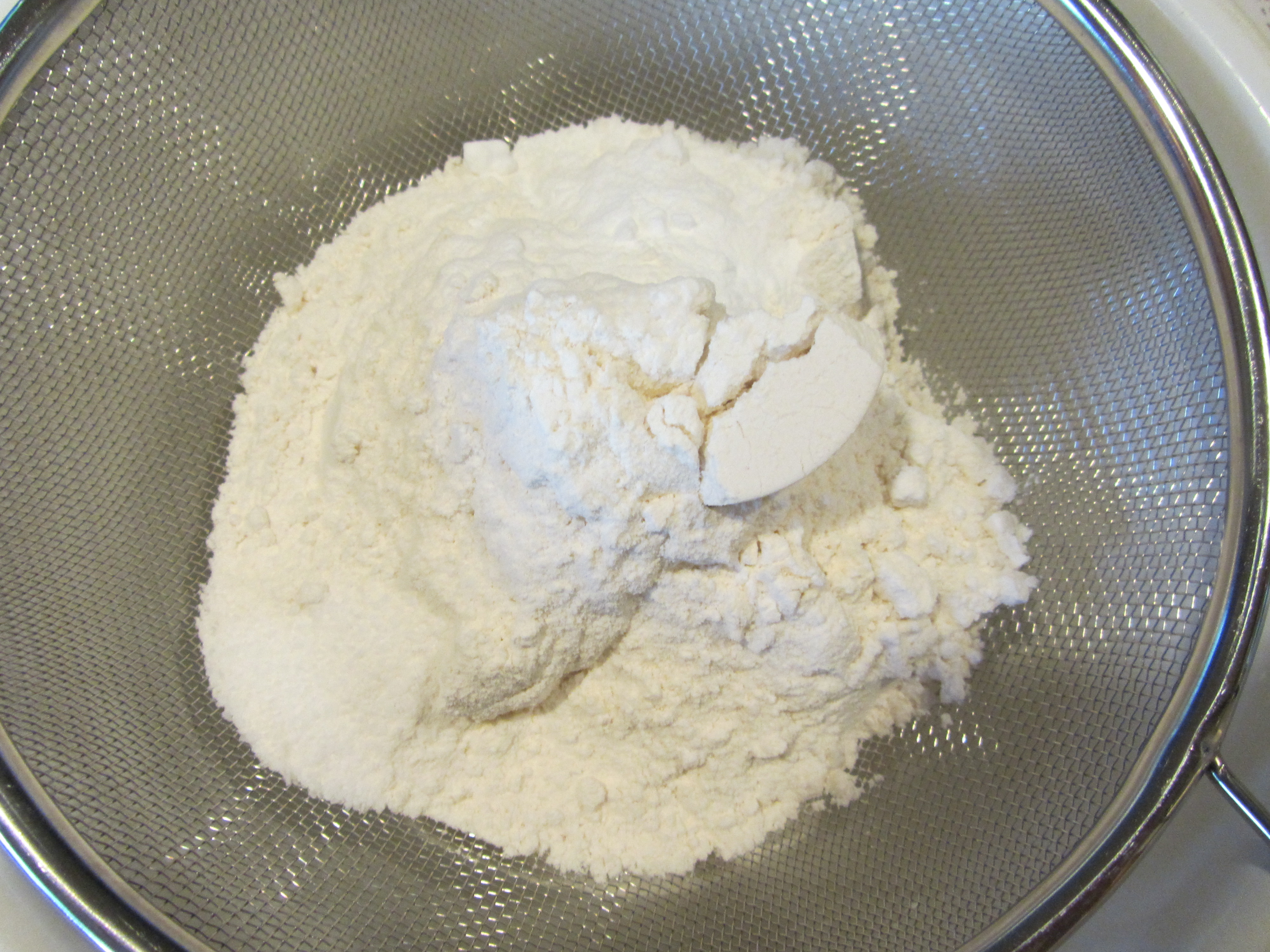 Sift together 2 1/4 C of cake flour, 1 t of salt, and 1 1/2 t of baking powder. Again, I used regular salt, as Alton did not specify in the episode that Kosher salt should be used.
