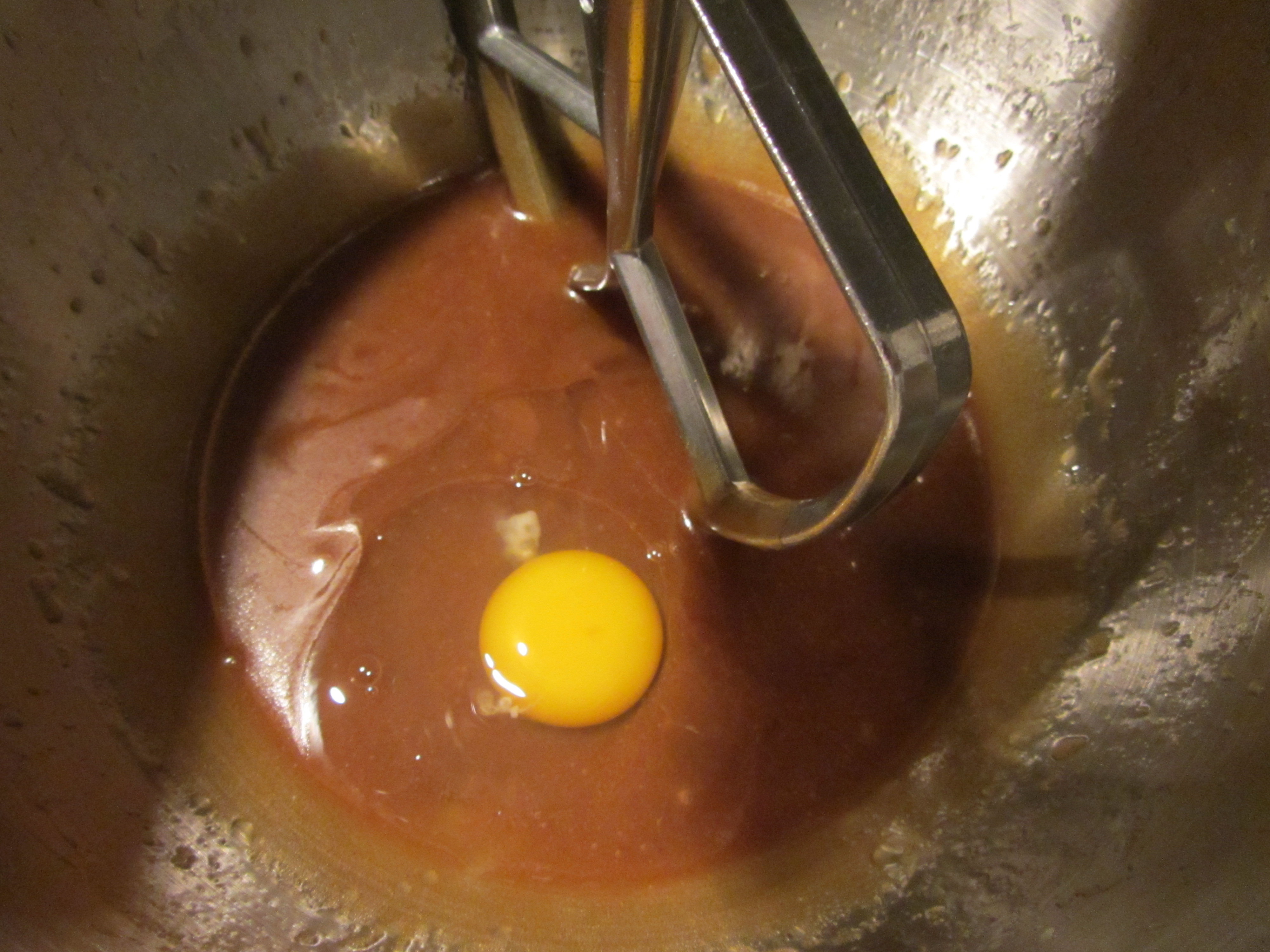 To this mixture add one egg, blending it in, and follow it up with an additional egg yolk.