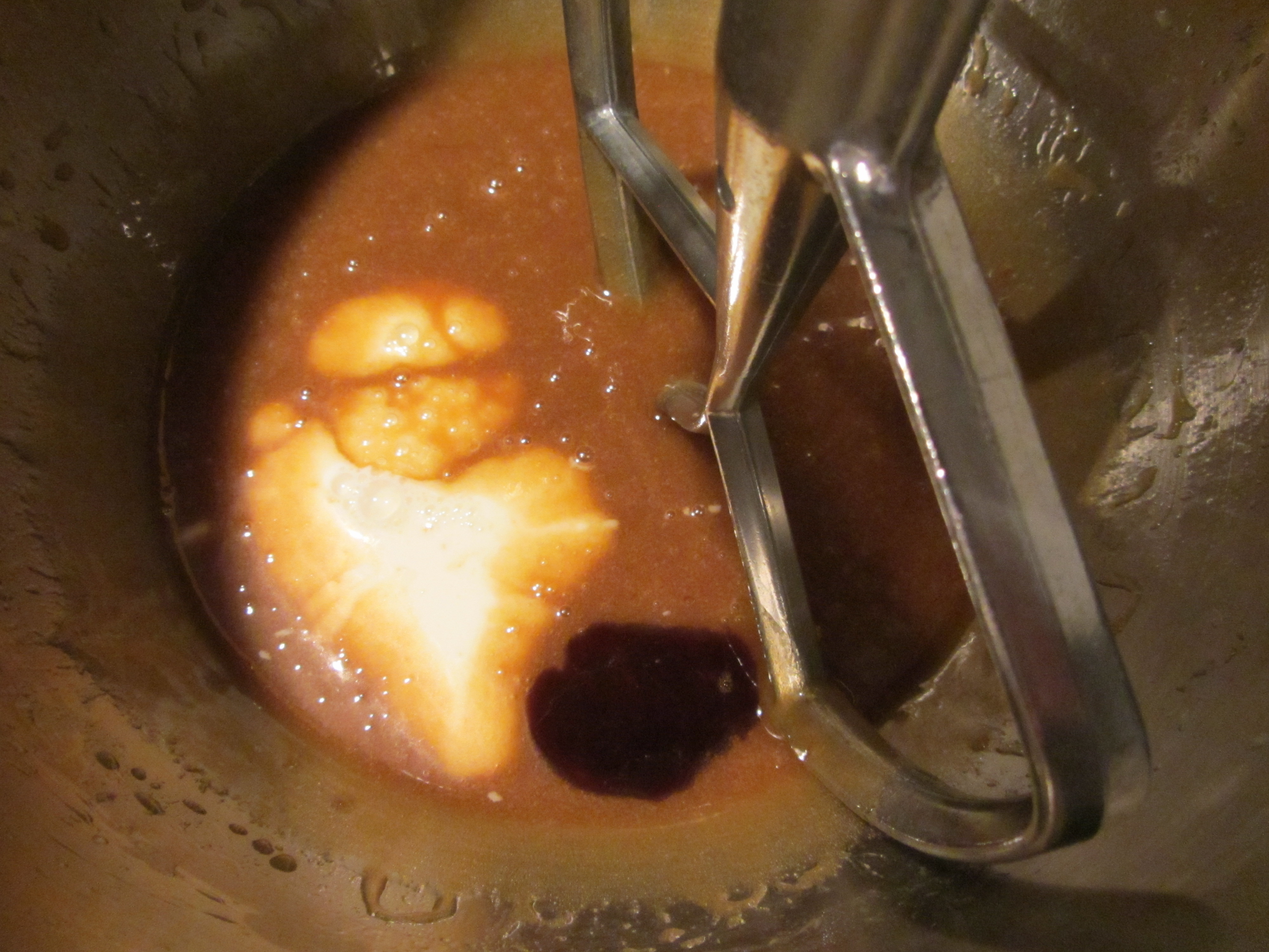 Once your butter is melted, combine it in your mixer with 1/4 C sugar and 1 1/4 C dark brown sugar.