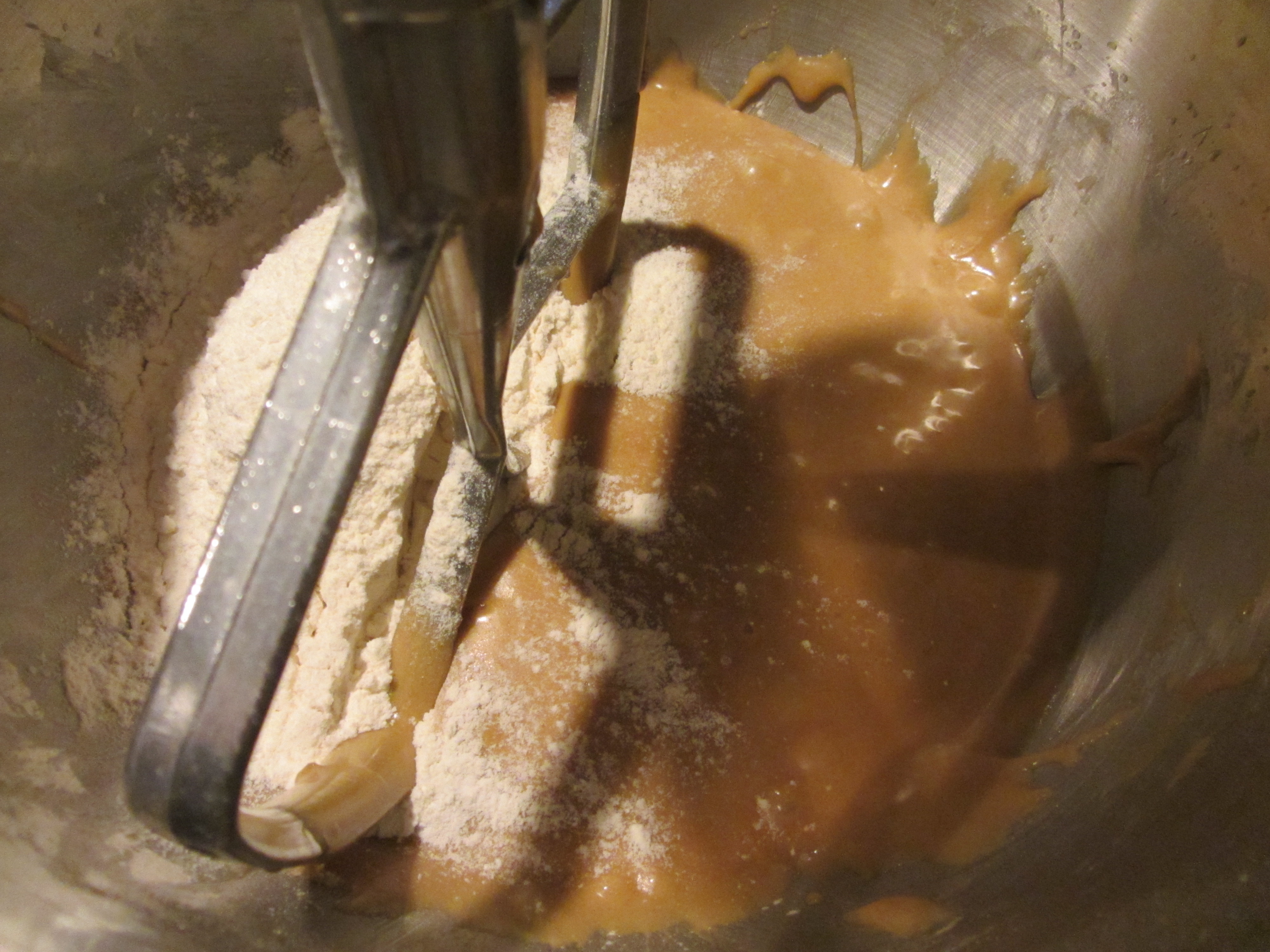 When all of the liquid ingredients are completely mixed, slowly add the dry ingredients, scraping the bowl between additions.