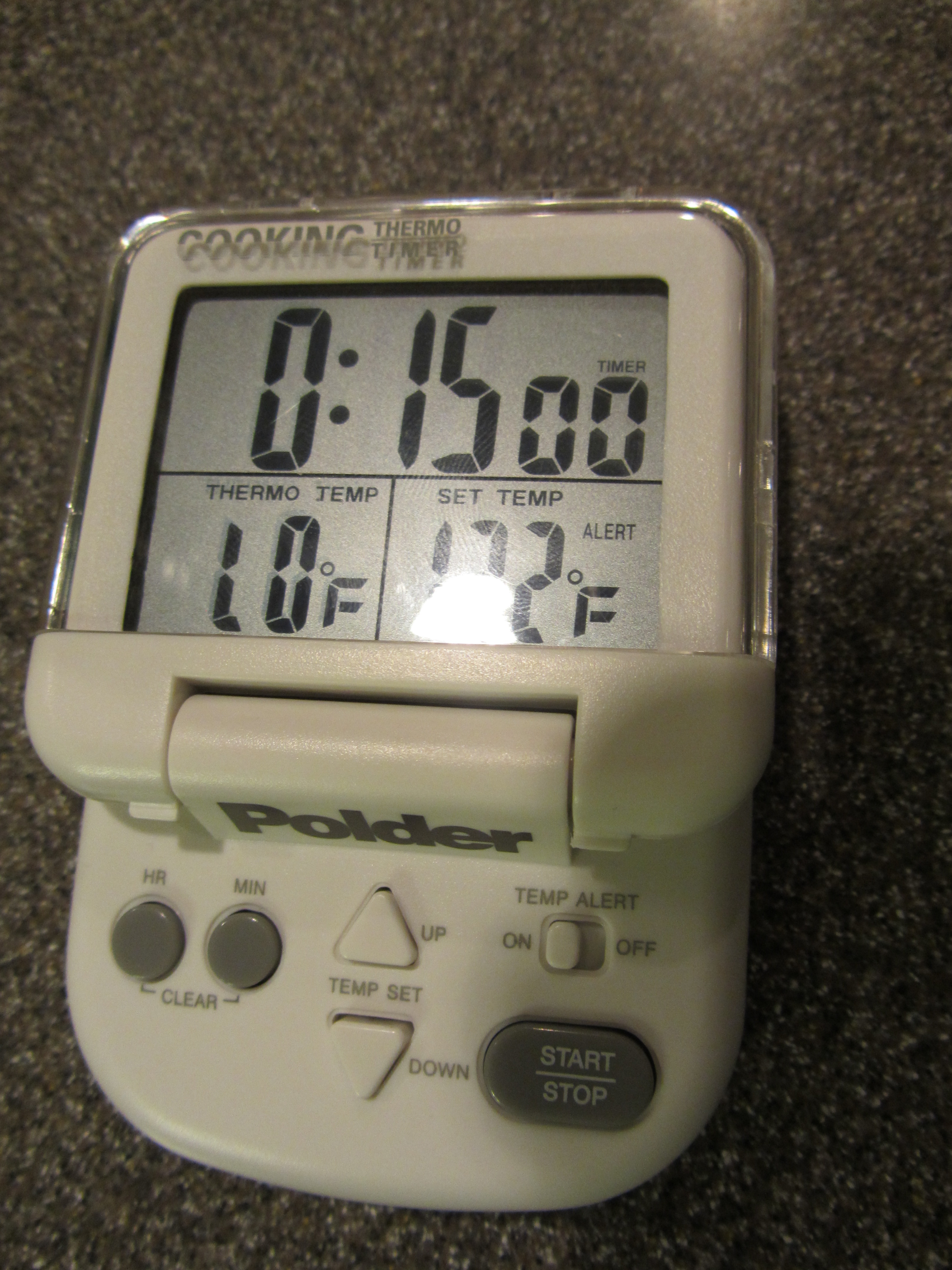 While the butter melts, sift together 2 1/4 C of bread flour, 1 t of Kosher salt, and 1 t of baking soda. Since Alton specified Kosher salt for this recipe, I used it here.
