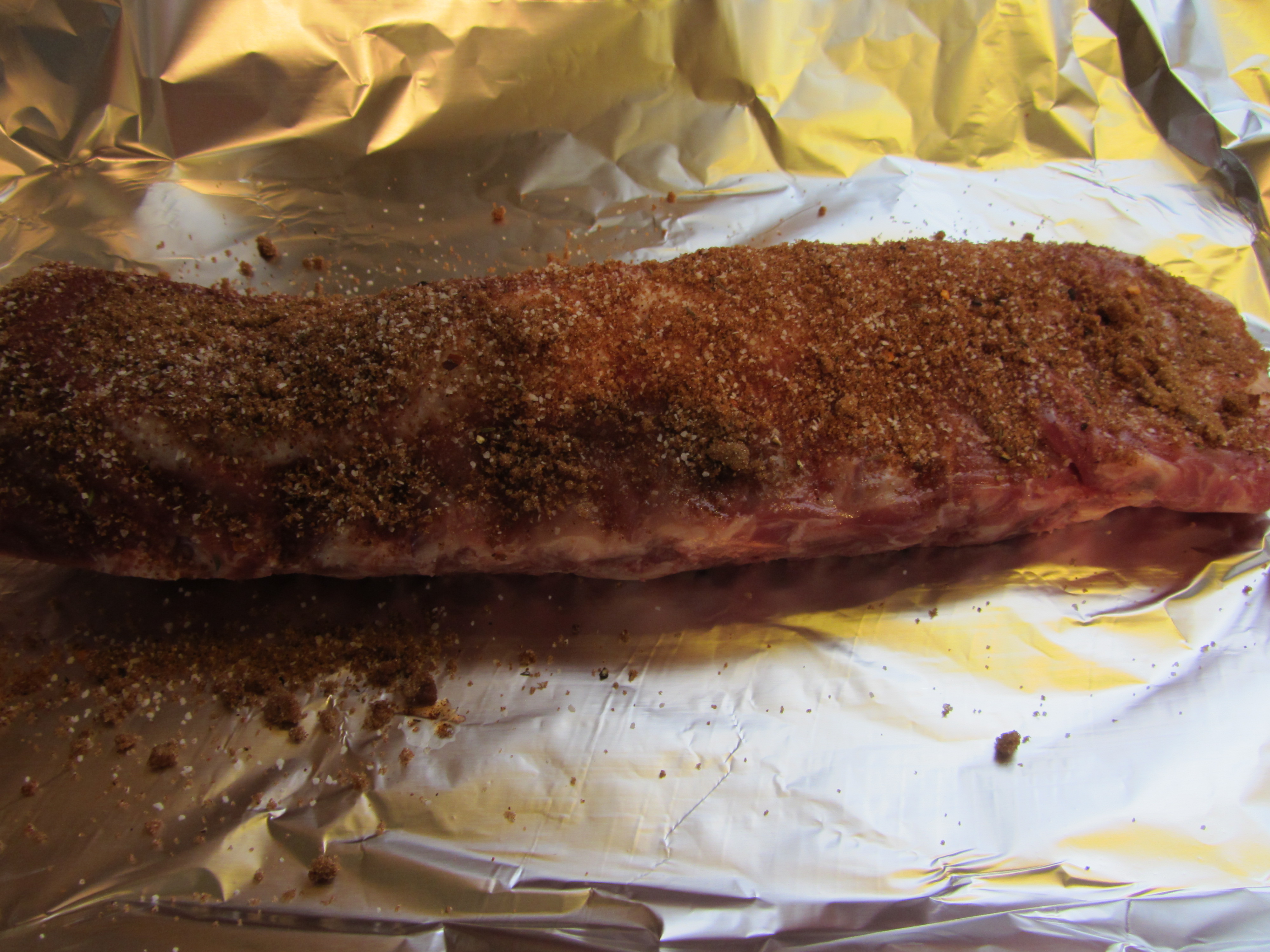 When my ribs were thawed, I placed them on a large sheet of heavy foil, which was placed shiny side down to slow heat absorption into the ribs.