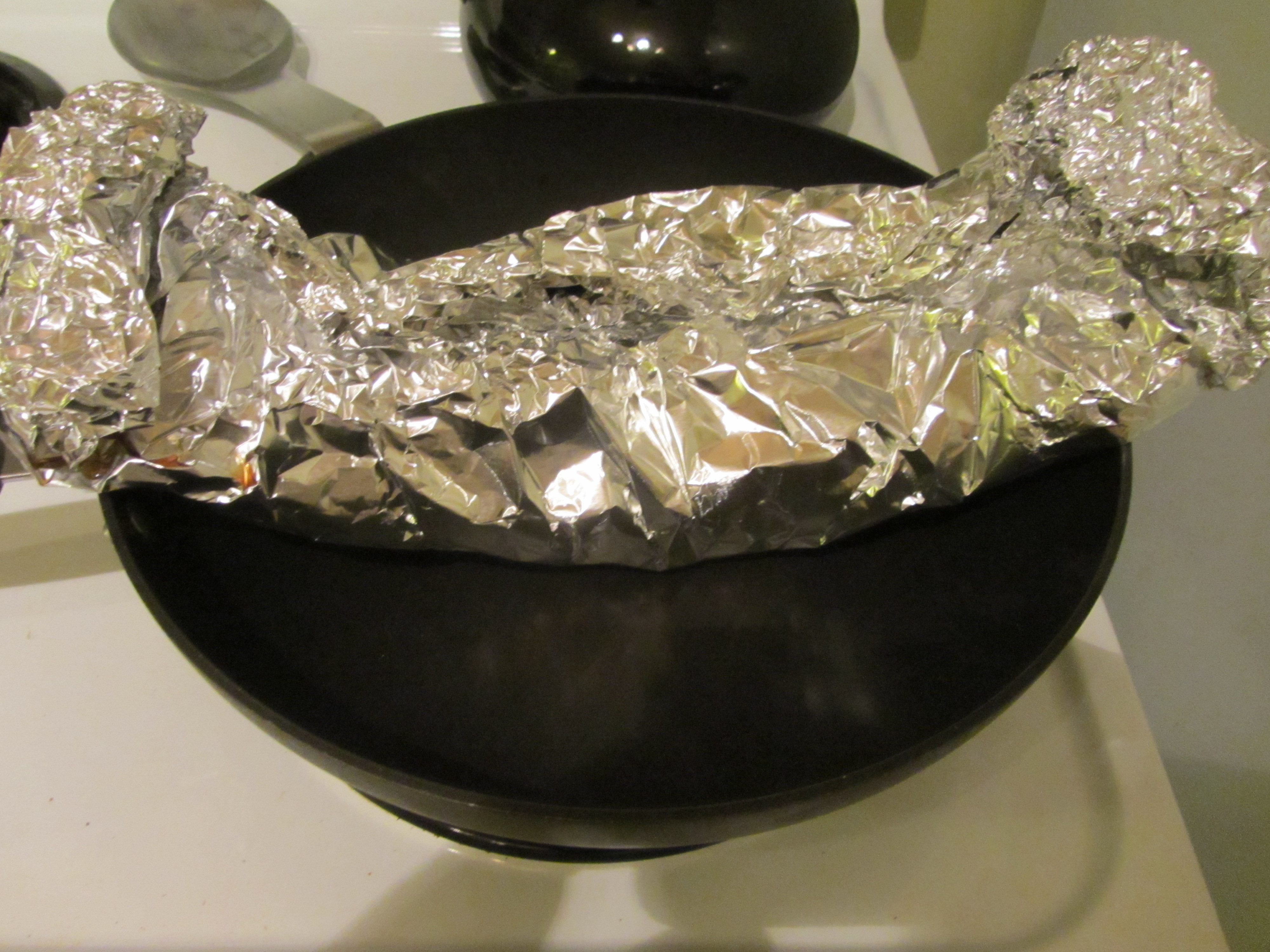 The braising liquid goes into the microwave for a minute or so until everything is dissolved, and then you pour it into one end of your rib packet, using the foil like a funnel, and lightly tilting the pan to let the liquid run through the foil packet.