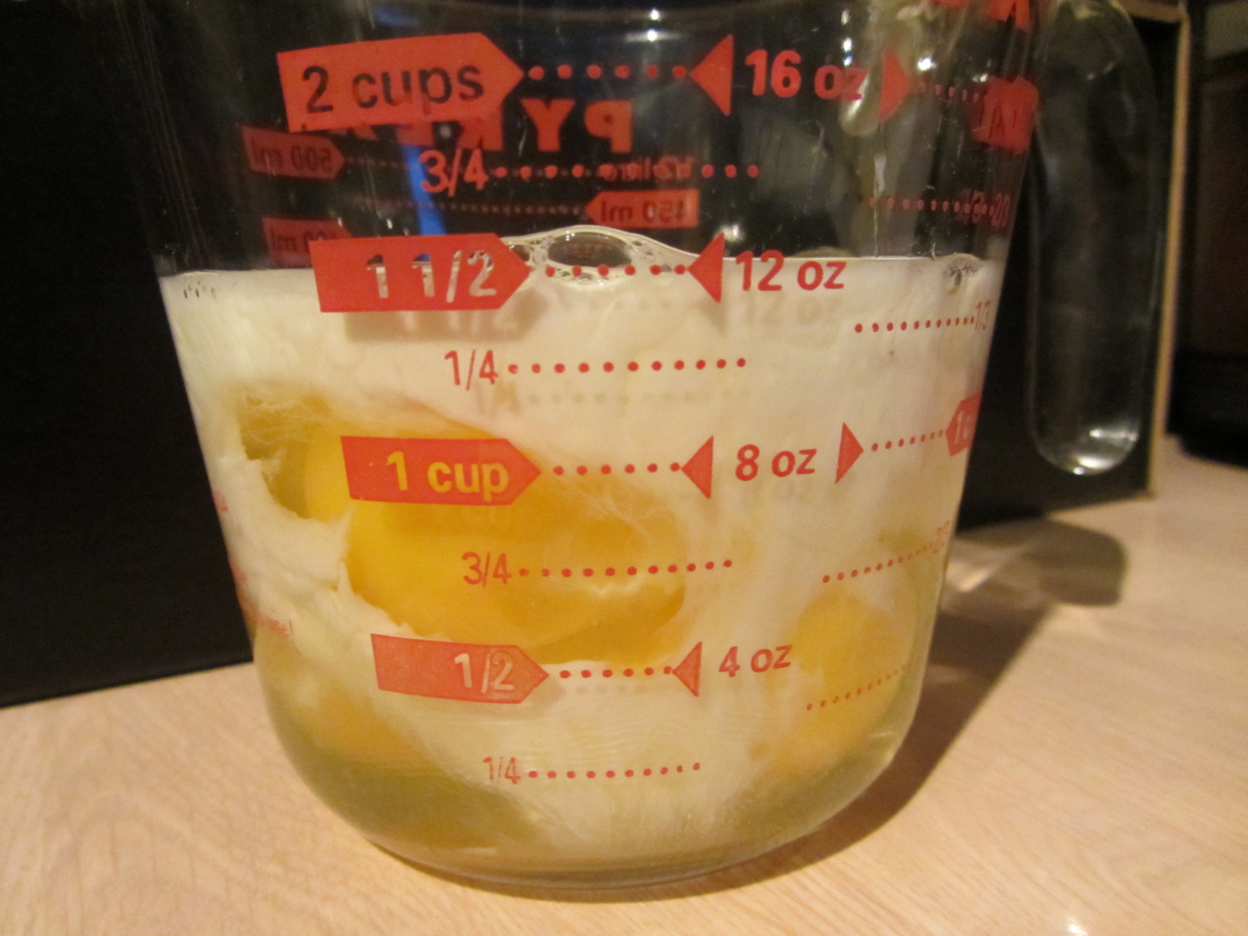 Three warmed eggs, cracked into a mug. Ready to beaten, along with some salt.