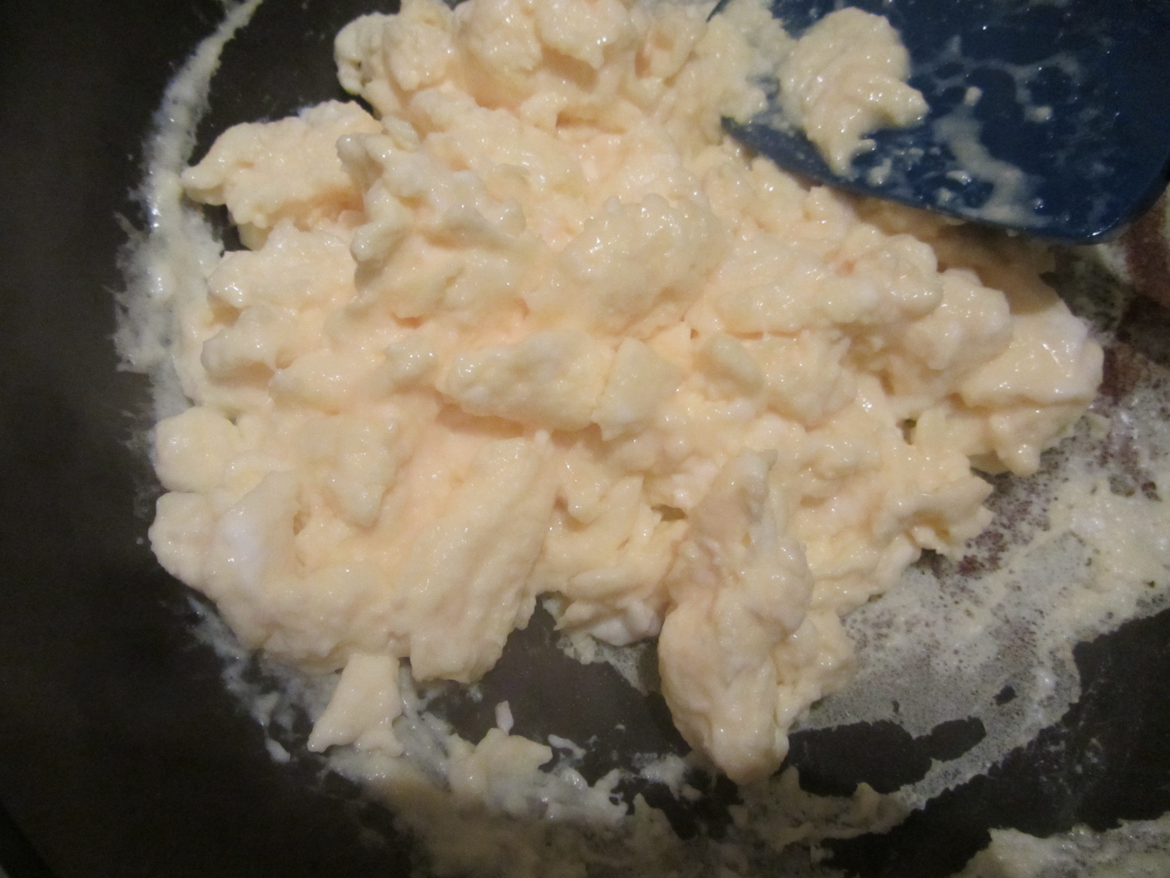 Meanwhile, heat a 9-inch non-stick pan to 325 degrees (or until butter foams) over medium-high heat. Once hot, lube the pan thoroughly with butter. Using a 4.5 ounce ladle, place one ladle of eggs in the center of the pan and stir briskly for five seconds with a spatula.