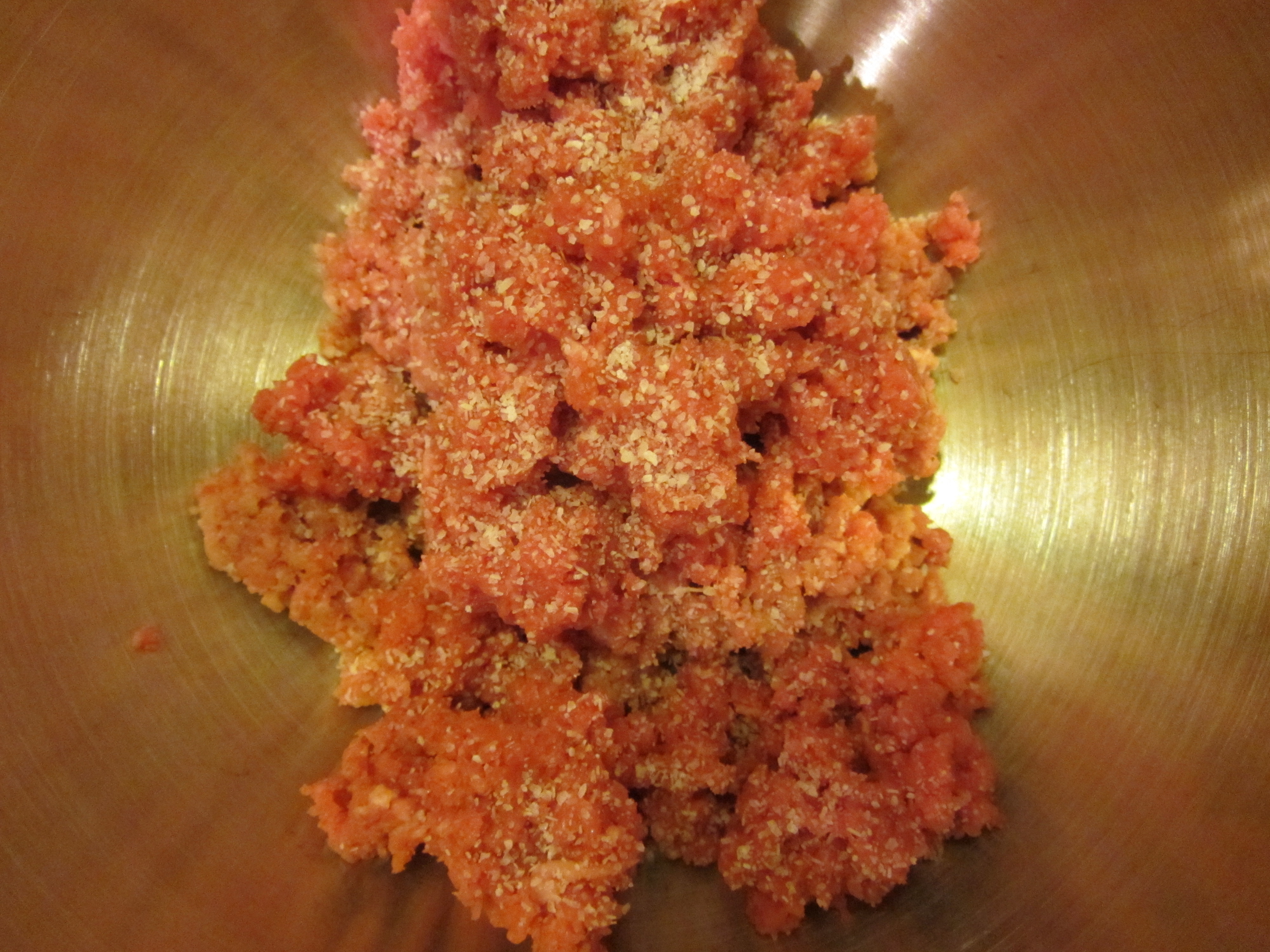 Alton’s baked meatballs are best mixed one day prior to eating, though you can get by with making them an hour before serving. Place the following ingredients in a large mixing bowl: 1/2 pound ground lamb, 1/2 pound ground pork, 1/2 pound ground beef, 1/2 t red pepper flakes, 1 1/2 t dried parsley, 1 1/2 t dried basil, 1 t garlic powder, 1 t Kosher salt, 1/2 C grated Parmesan, 1 egg, 1/4 C bread crumbs, and 5 ounces of frozen spinach that has been thawed/squeezed.