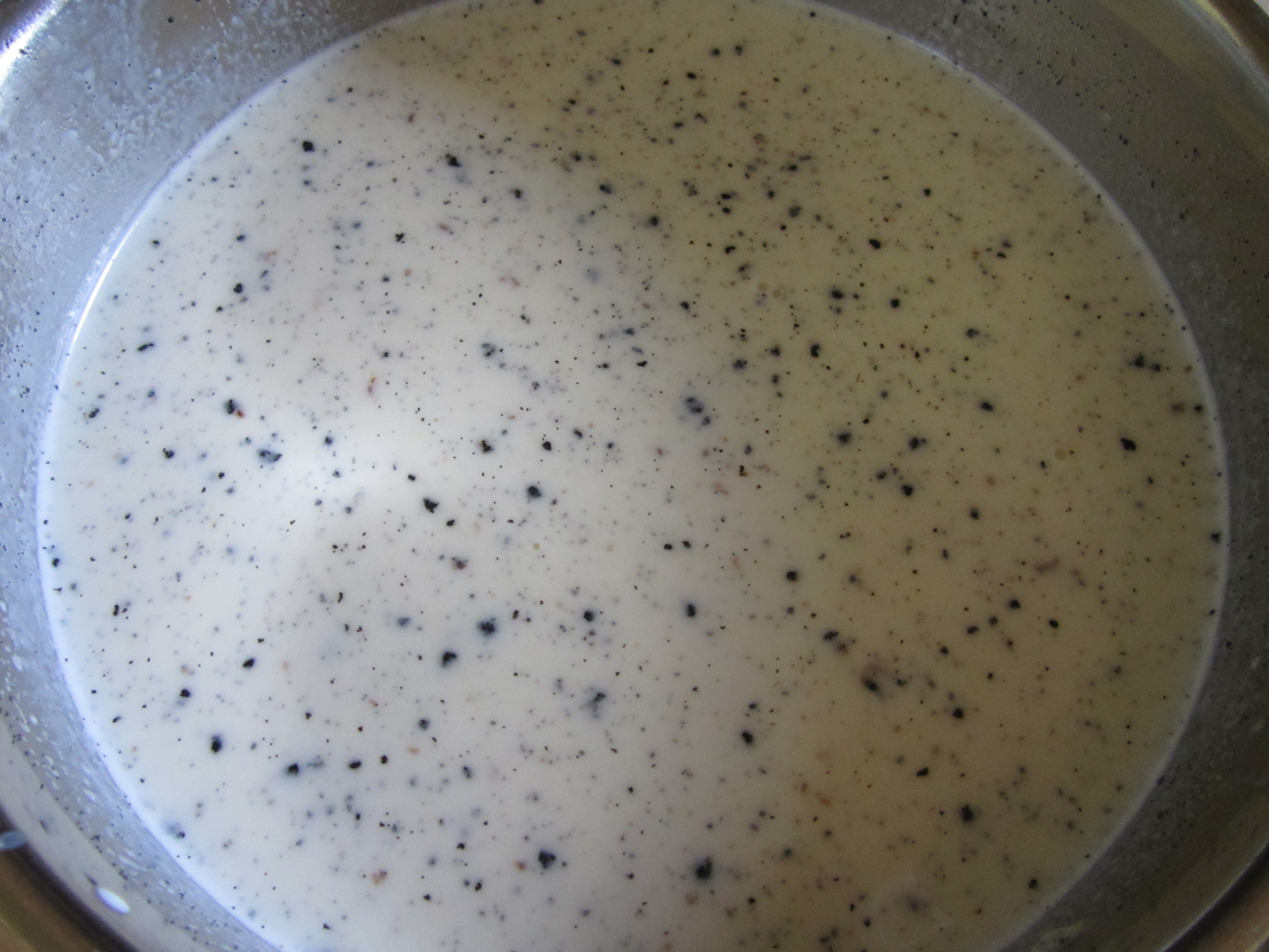 Next, add 2 C whole milk and 1 C heavy cream slowly to the yolks.