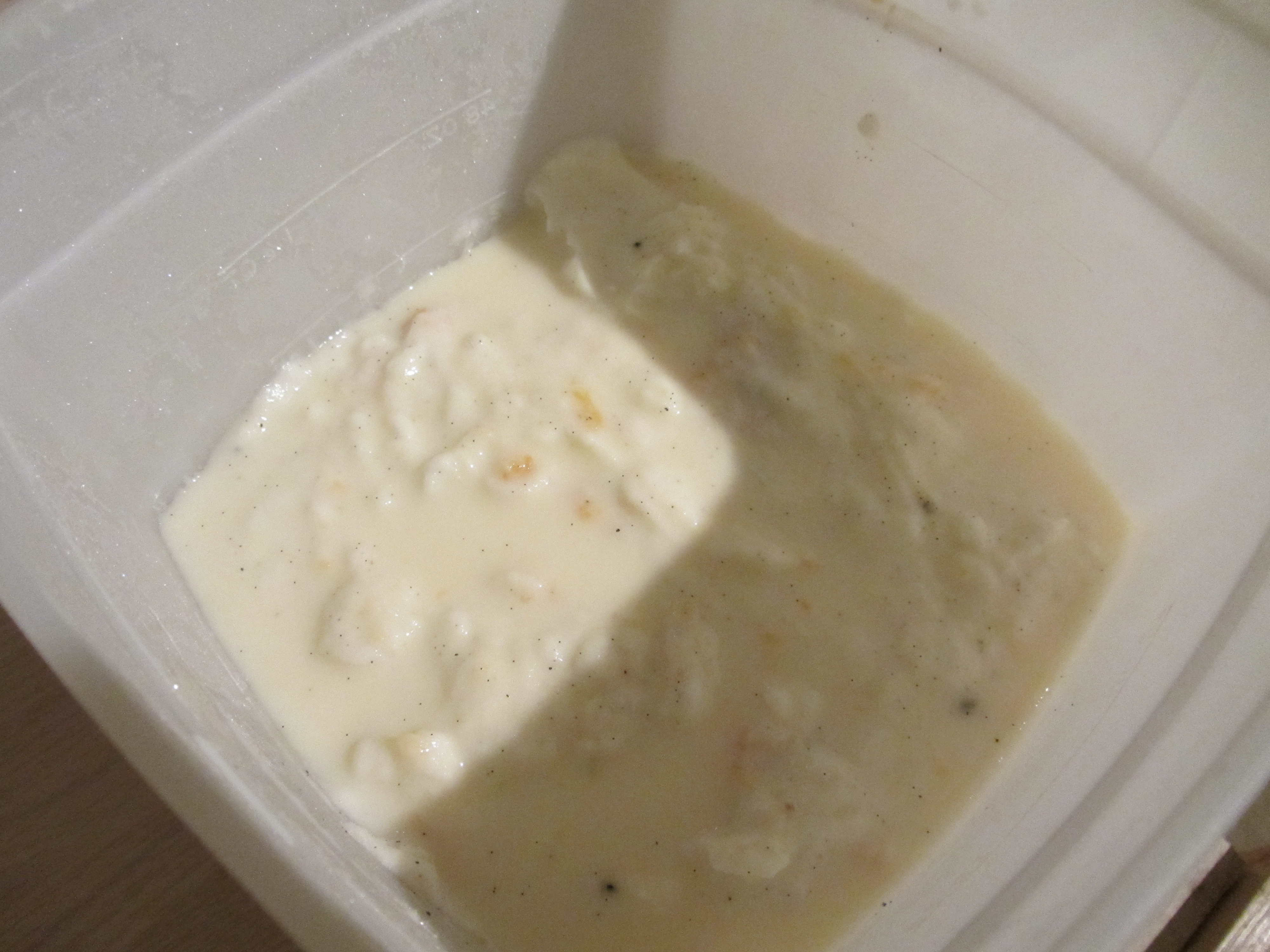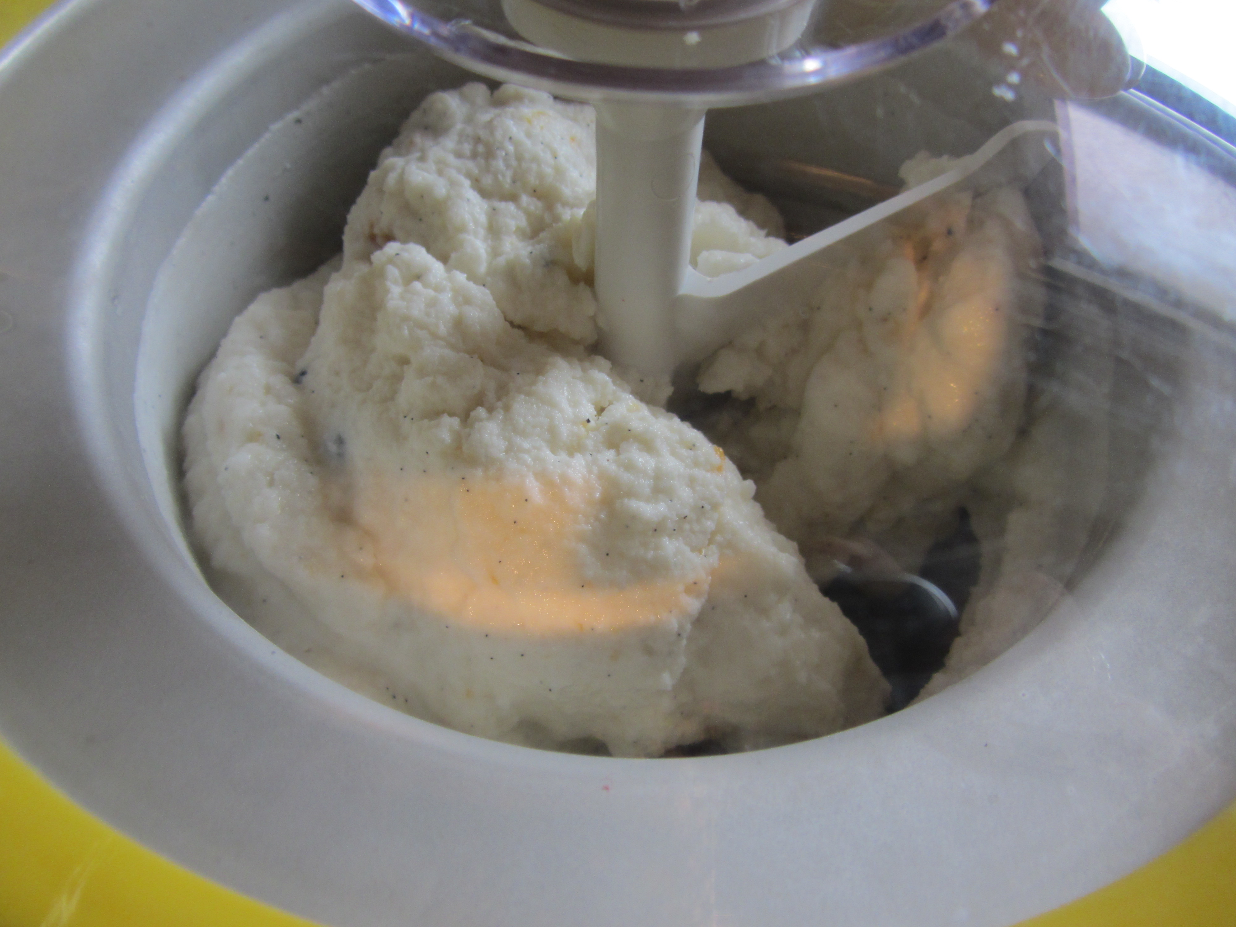 To drink as eggnog, fold in 4 pasteurized egg whites that have been beaten to stiff peaks and serve. Alternatively, to make ice cream, do not add the egg whites. Rather, just chill the custard overnight and churn it in an ice cream maker. Since I had already made the uncooked recipe for eggnog, I churned my cooked eggnog base in my ice cream machine.