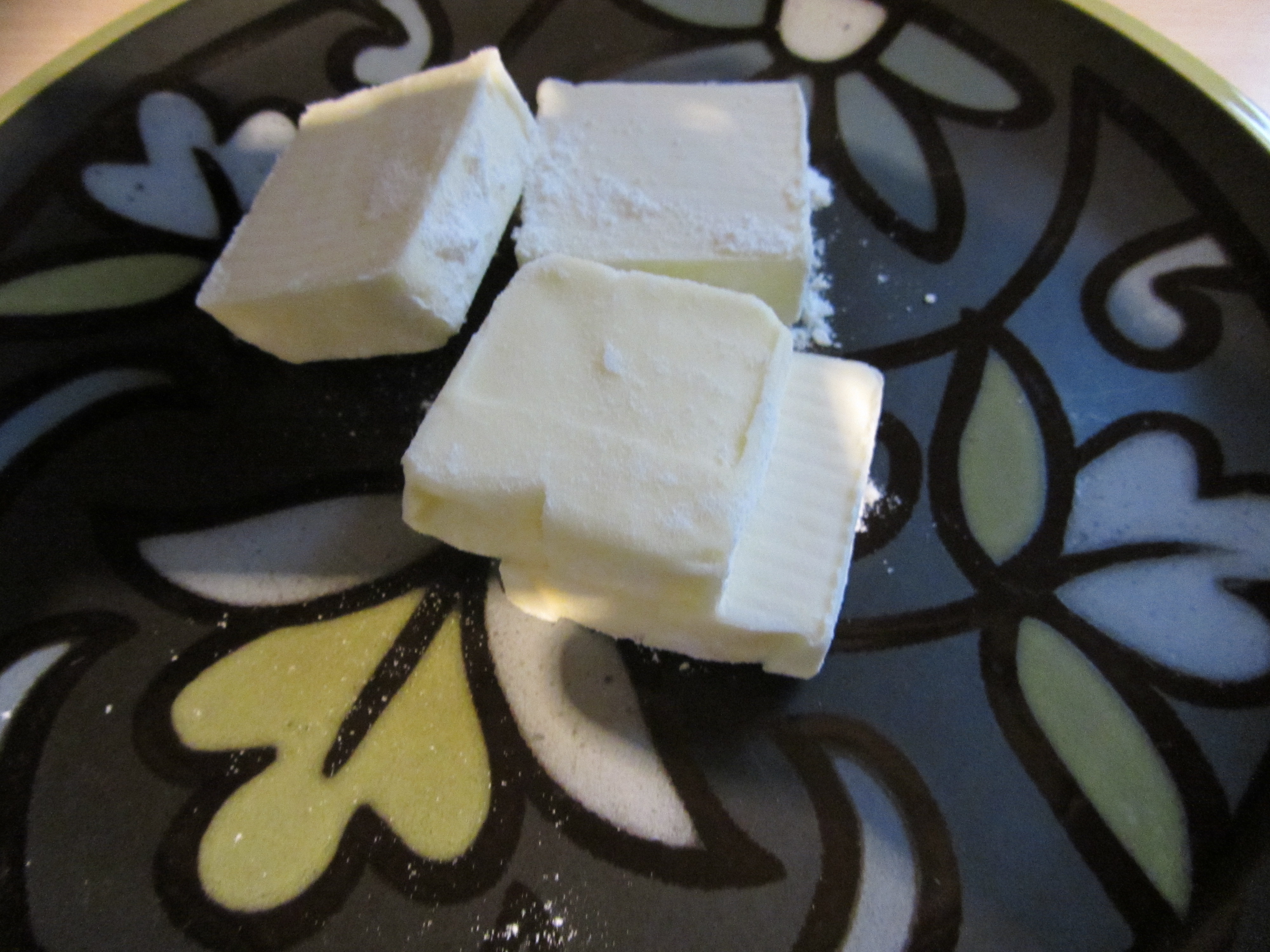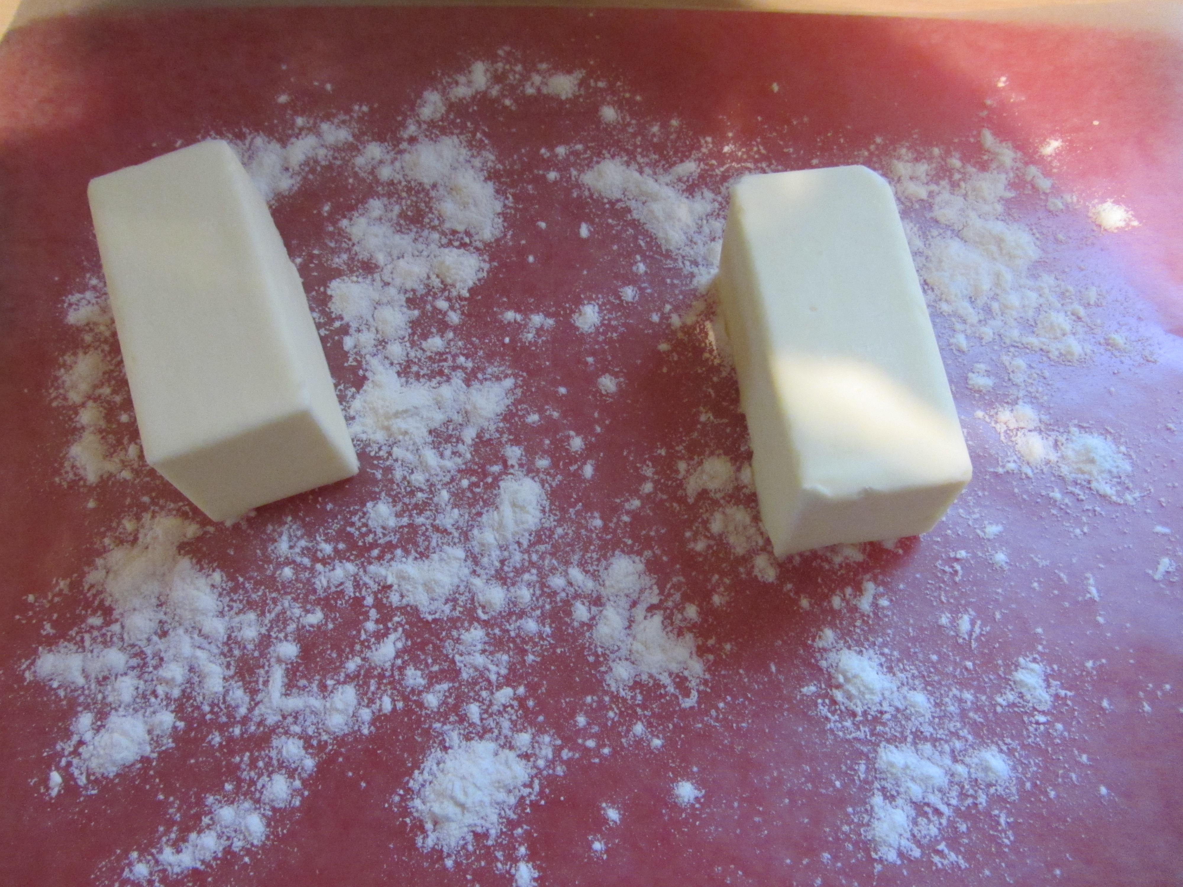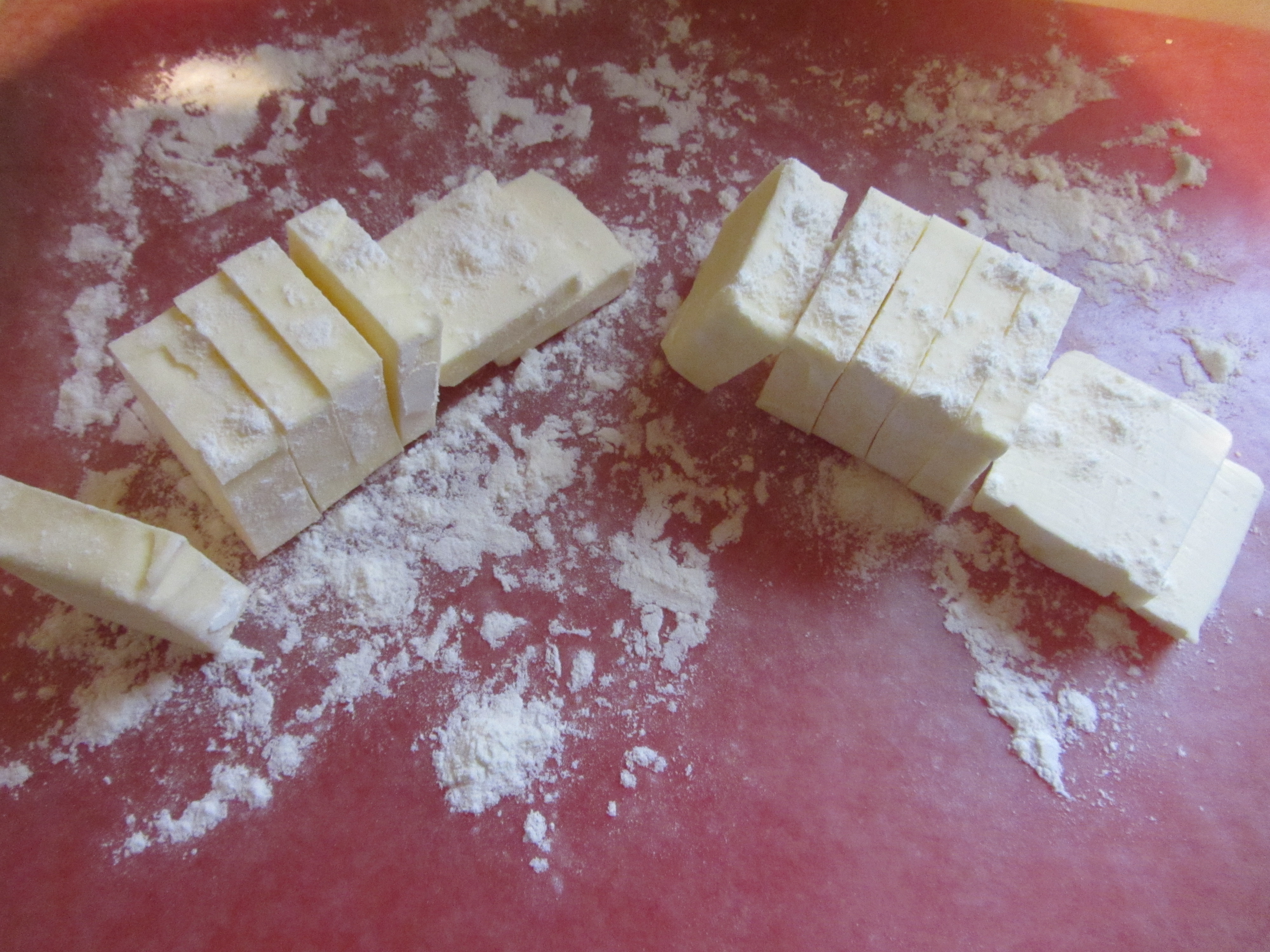 Meanwhile, you coat two sticks of butter in some flour and cut them into pieces.