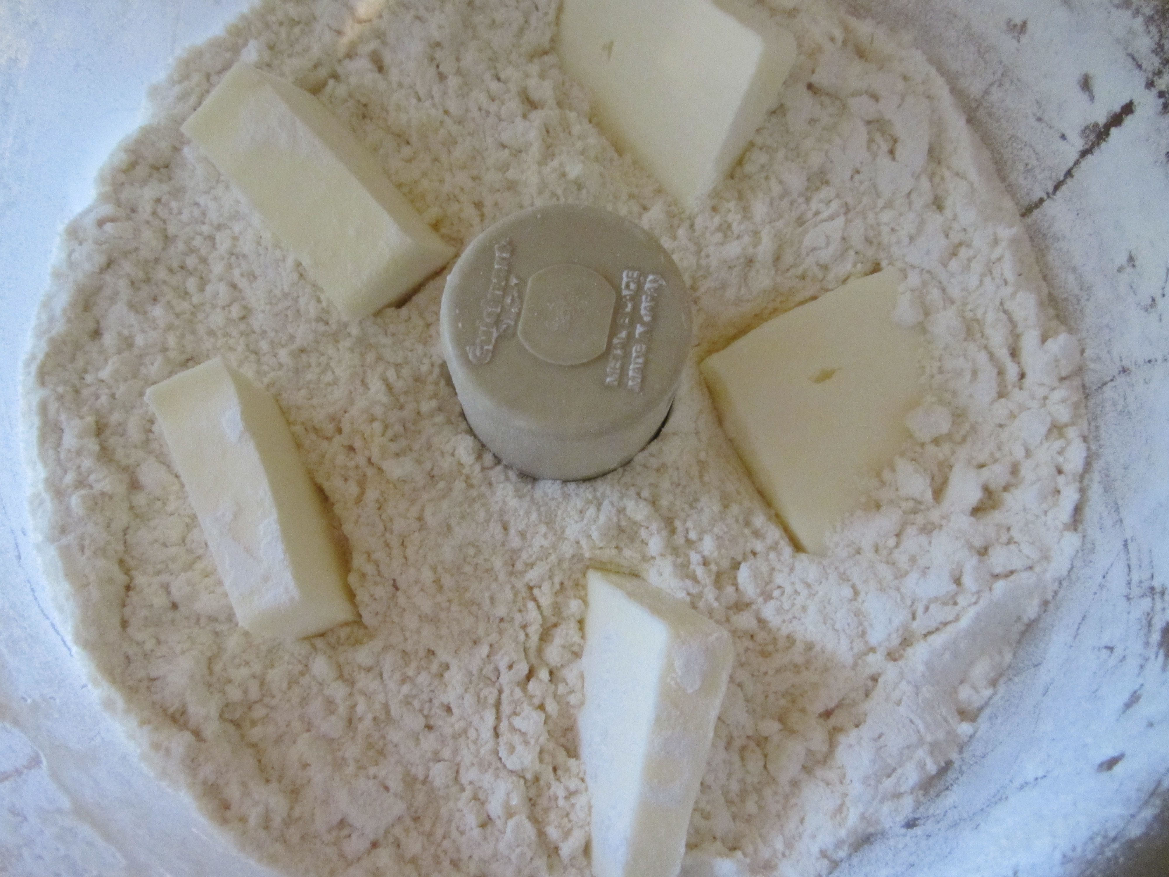 Once your ingredients are thoroughly chilled, you pulse your dry mix in a food processor, adding the room temperature butter, and pulsing until the fat is no longer visible.