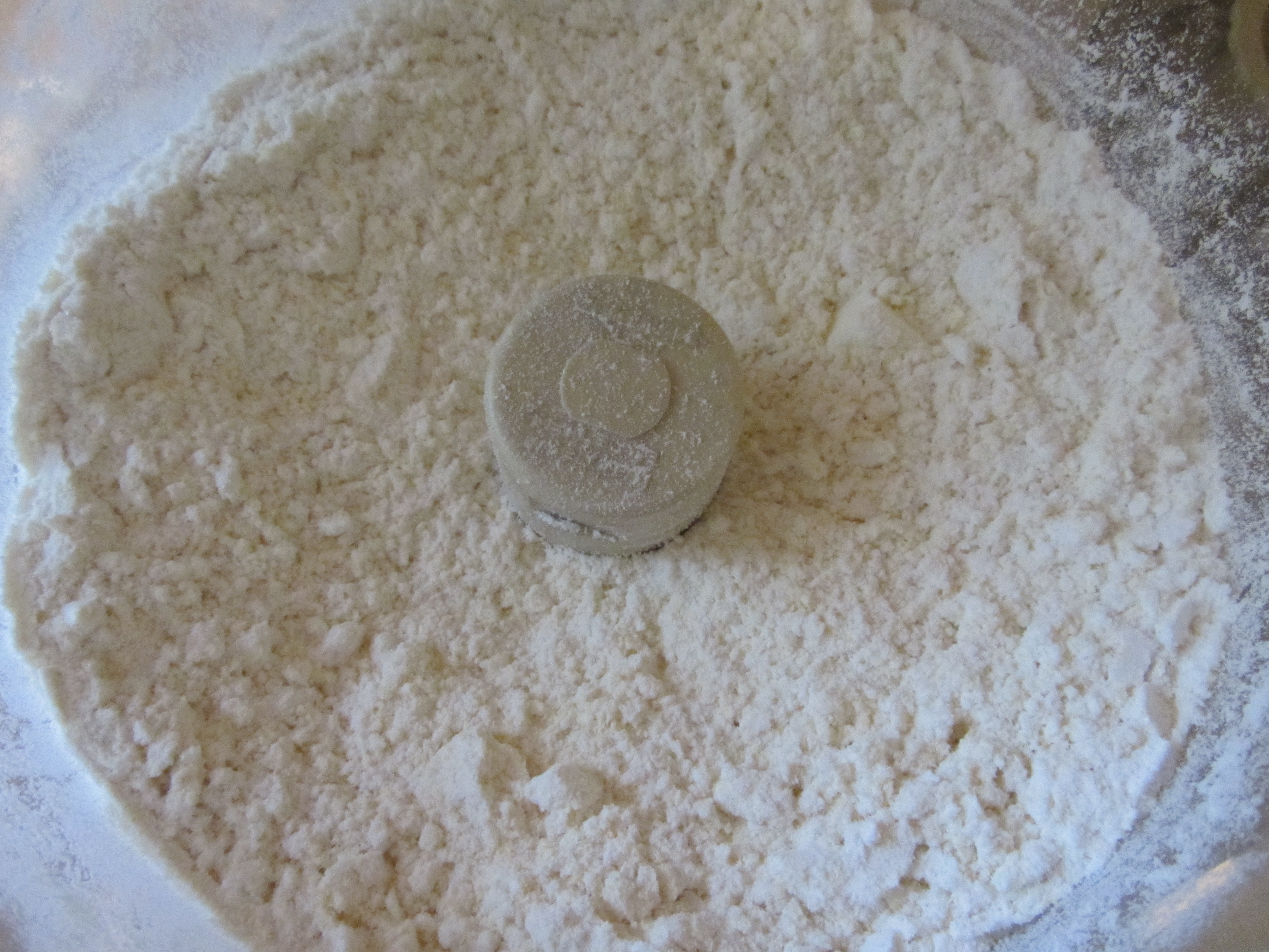 Roll the dough until it is 1/2″ thick and cut rounds with a 2.5 inch circular cutter. Roll each round until it is a thin disc measuring 5-6 inches in diameter. Place the dough rounds between sheets of wax paper and let them chill in the refrigerator for 1-2 hours before forming pies.