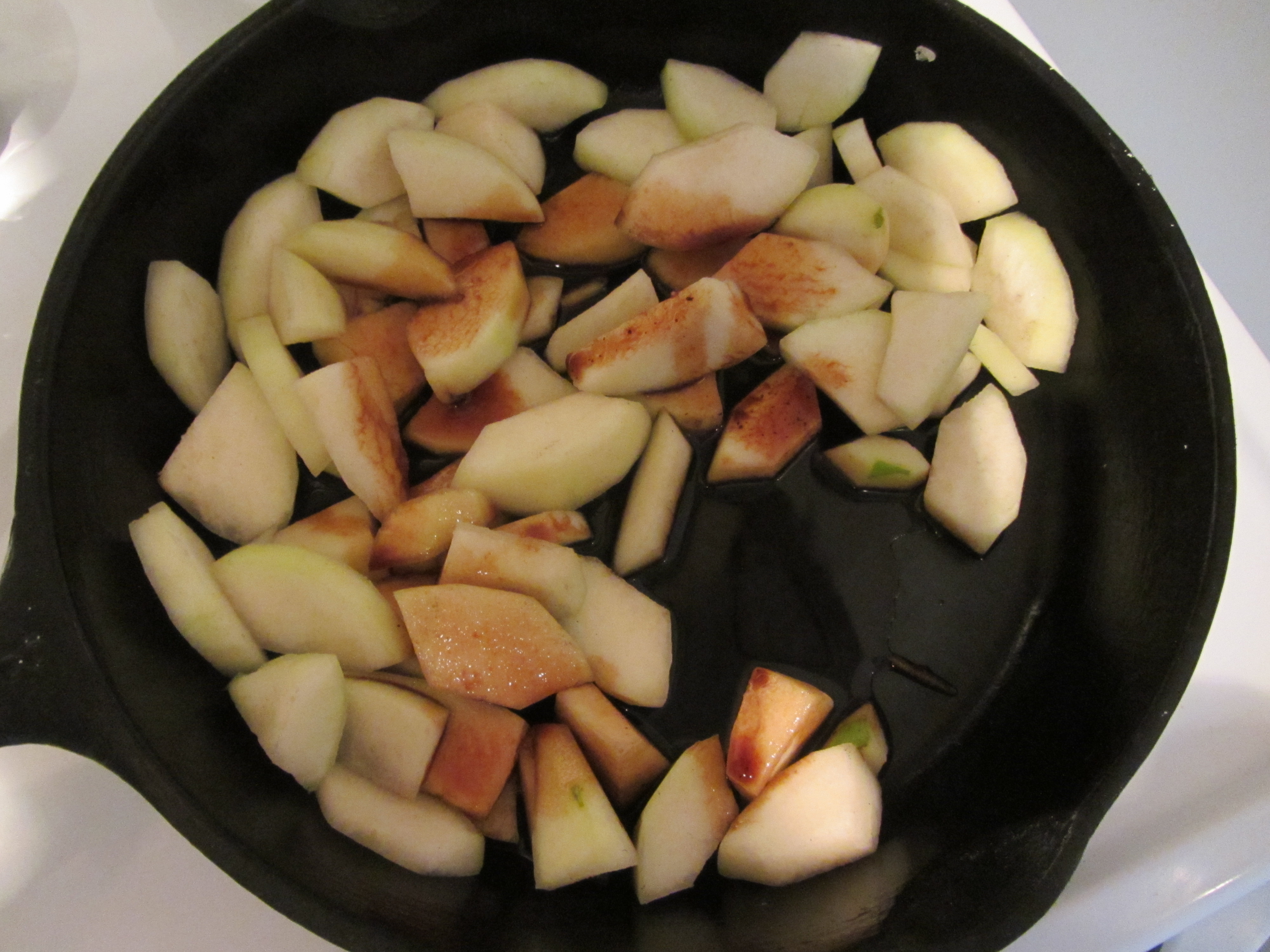 To a hot iron skillet, you add two Anjou pears, peeled, cored, and sliced.