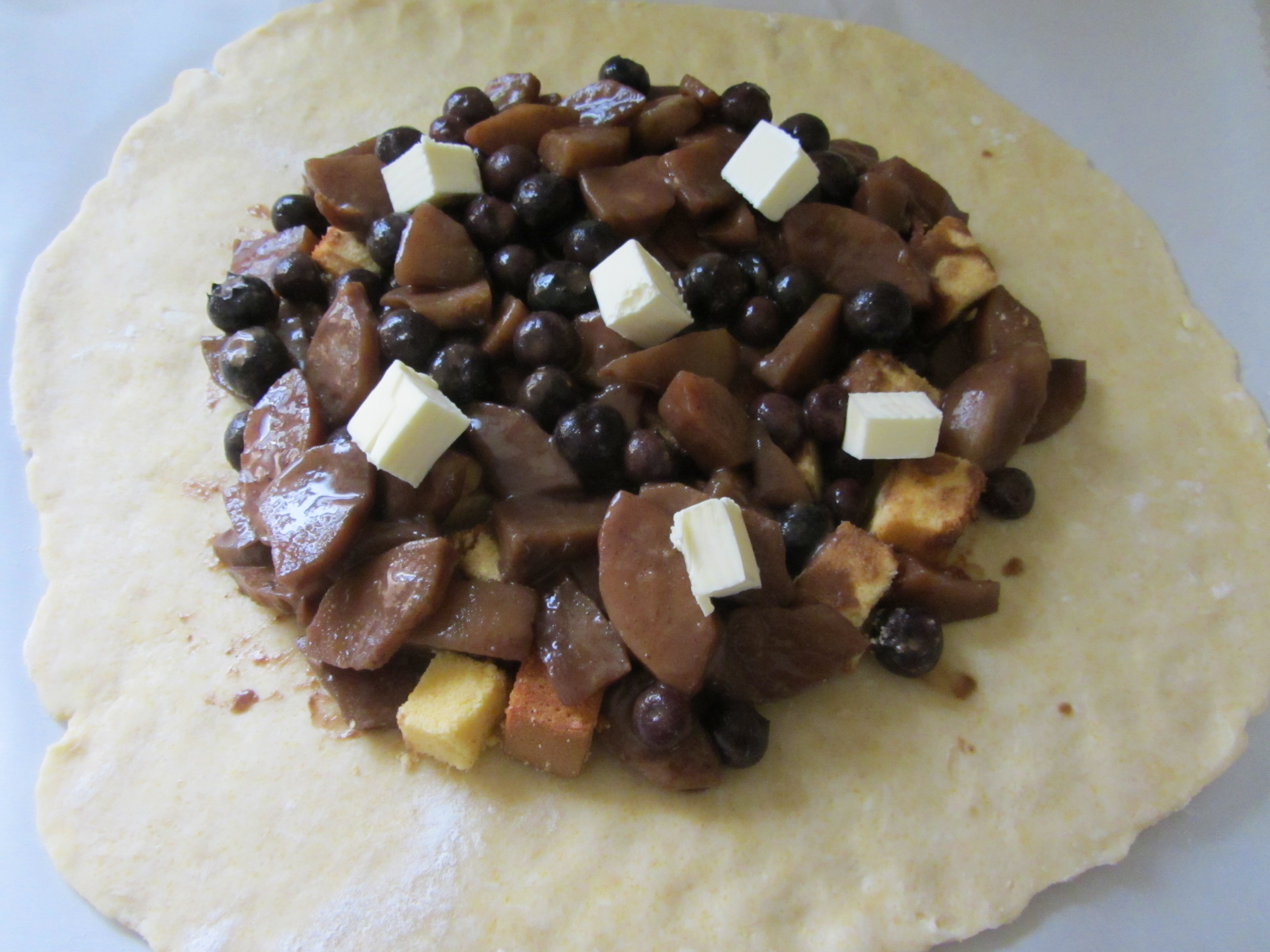 In the center of your dough circle, you place pound cake cubes (I used frozen pound cake), and top this with your fruit filling. Some clumps of butter are dotted over the filling, and you can begin folding up your dough.
