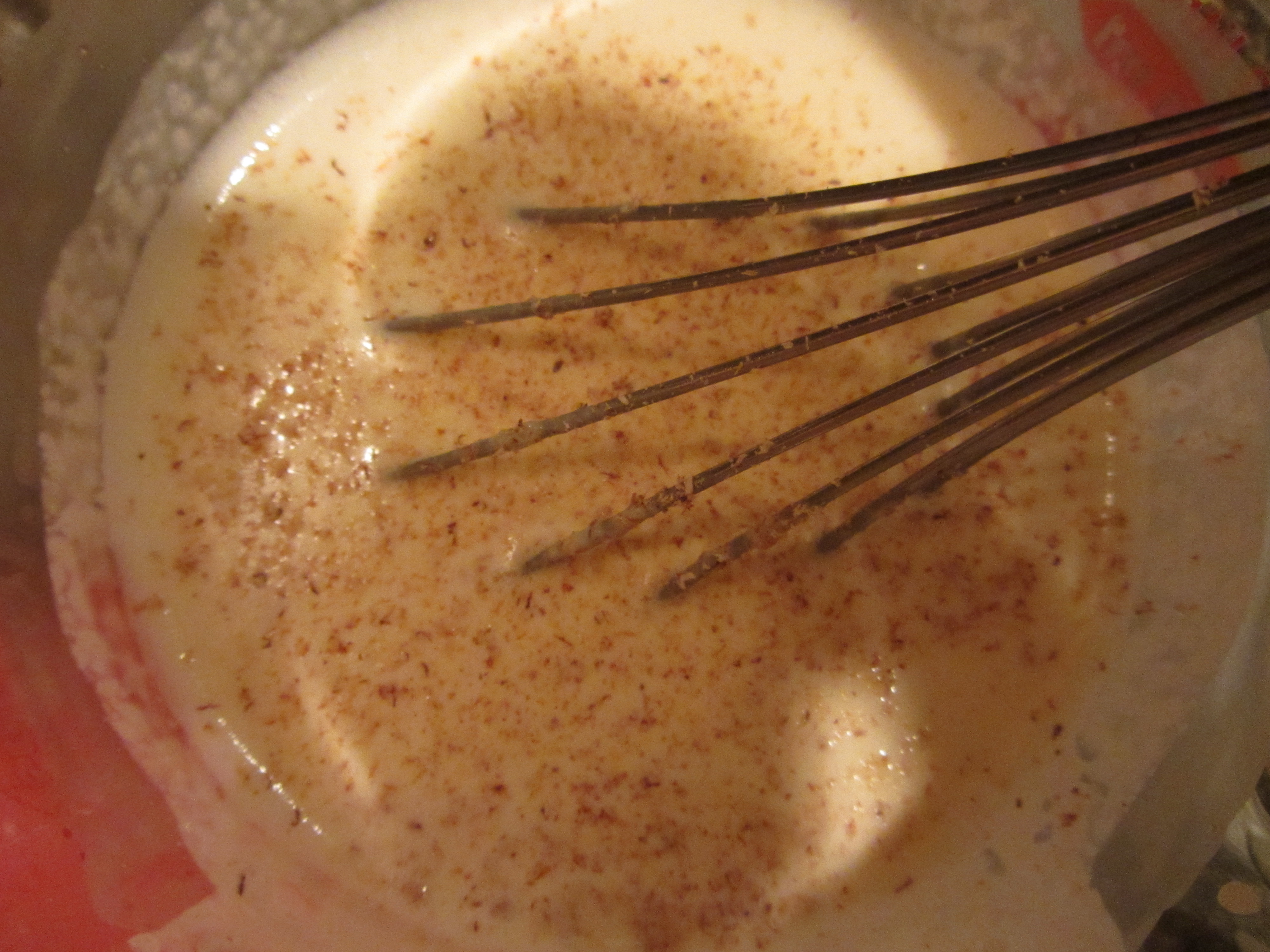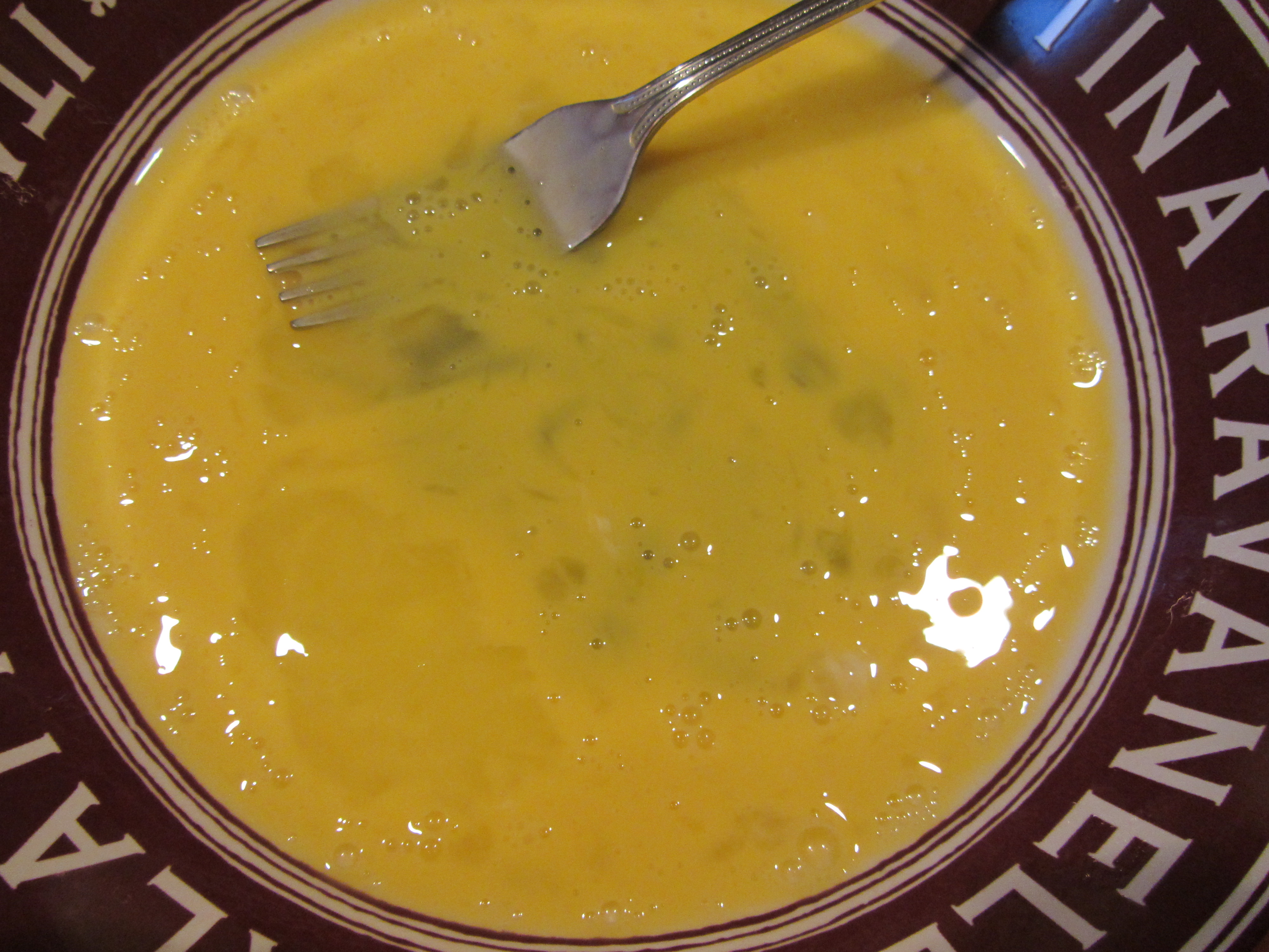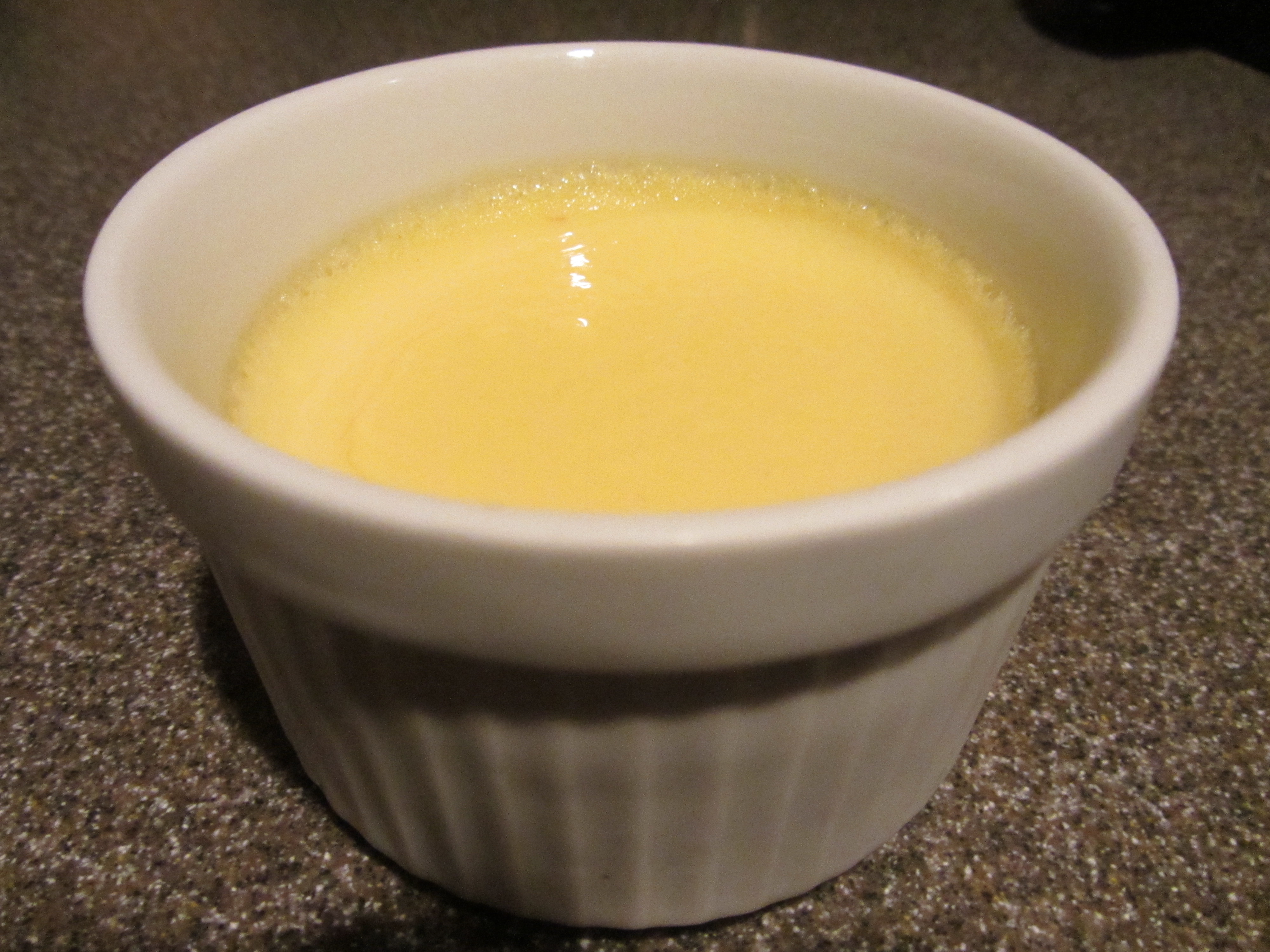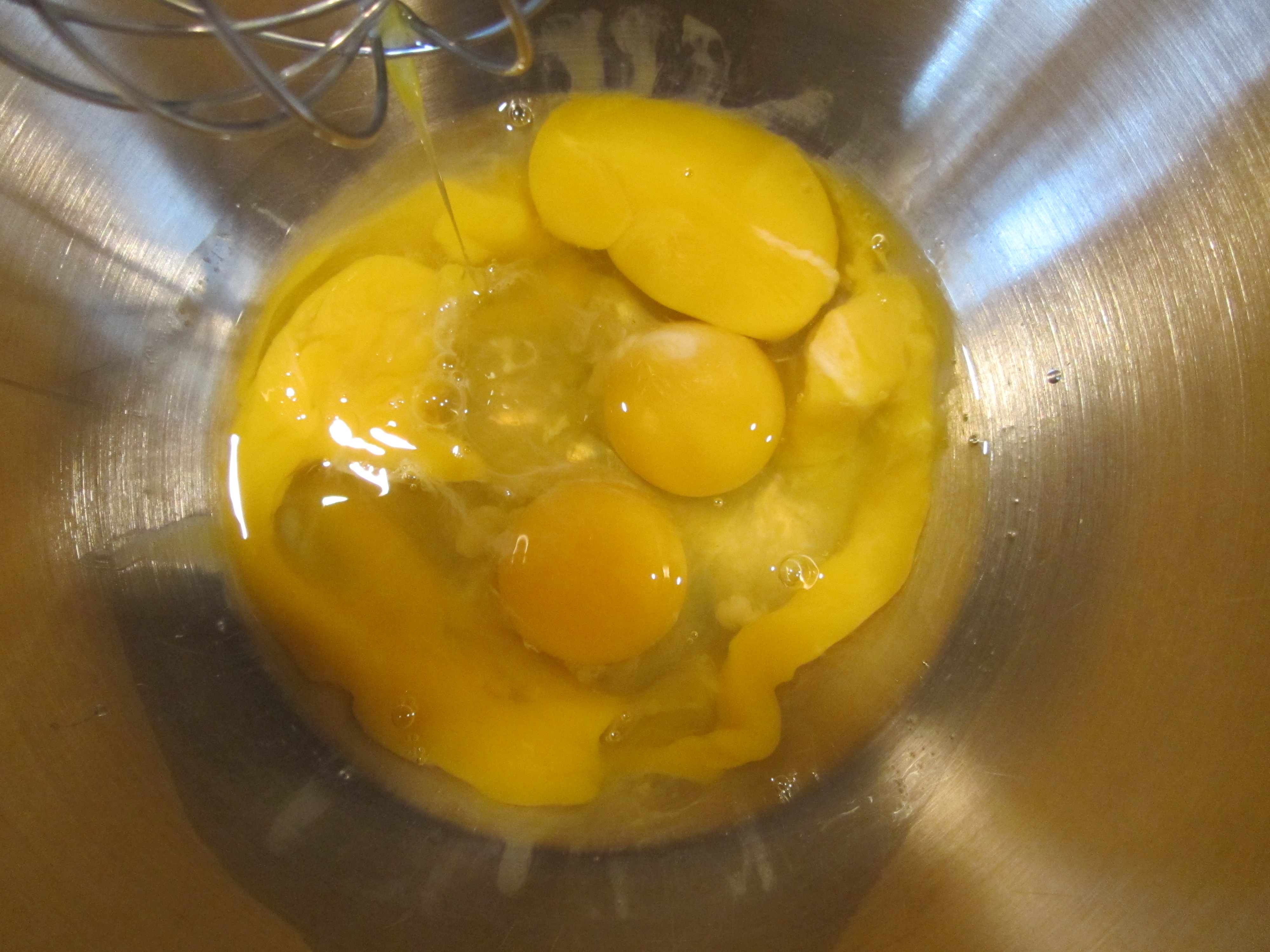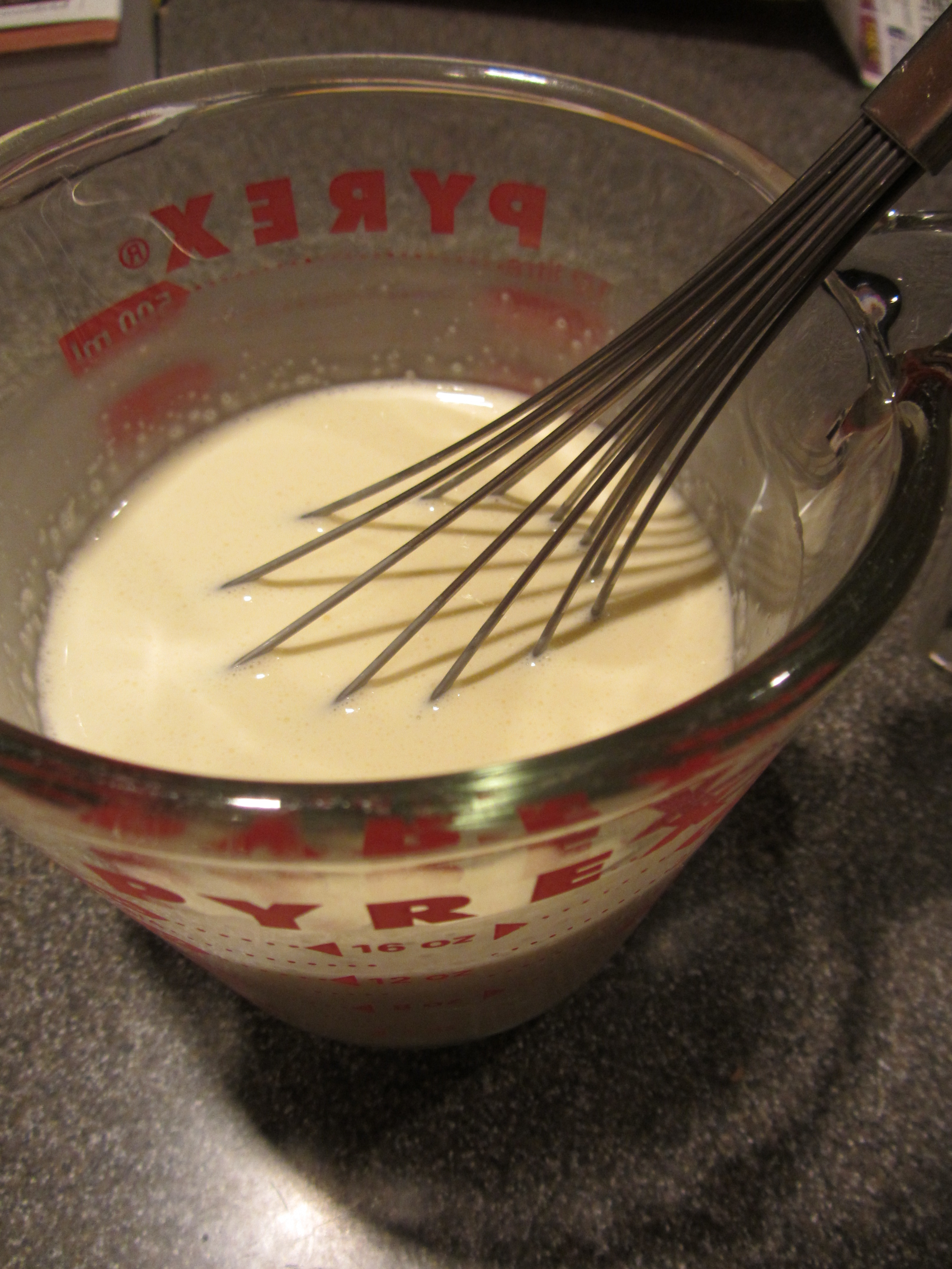 For my toppings, I chose caramel ice cream topping and Alton’s blueberry jam I wrote about here. Unfortunately, I made the horrible error of accidentally purchasing fat-free caramel. Yuck! I did not have time to make a homemade caramel, so I had to go with the fat-free junk and hope for the best. In retrospect, I probably should have opted for plain flan. In a bowl, whisk three eggs and three egg yolks until they are thick and light.